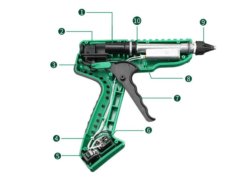 (Клеевой пистолет 60 Вт, Разъемный шнур питания)1. Рукав герметичная, силиконовая2. Порт для вставки ленты3. Триггер сцепления двойного материала4. Встроенная кабельная стяжка5. Разъем шнура питания6. Переключатель7. Ленточный триггер8. Нагреватель9. Силиконовая защита от ожогов во рту10. Термостойкий клей, герметичная конструкция