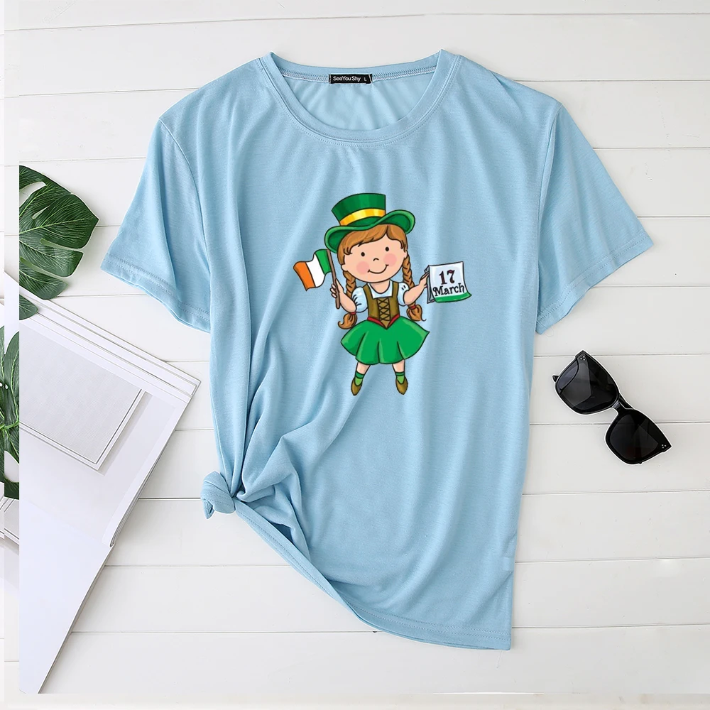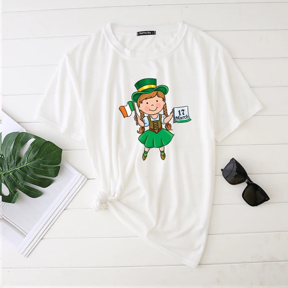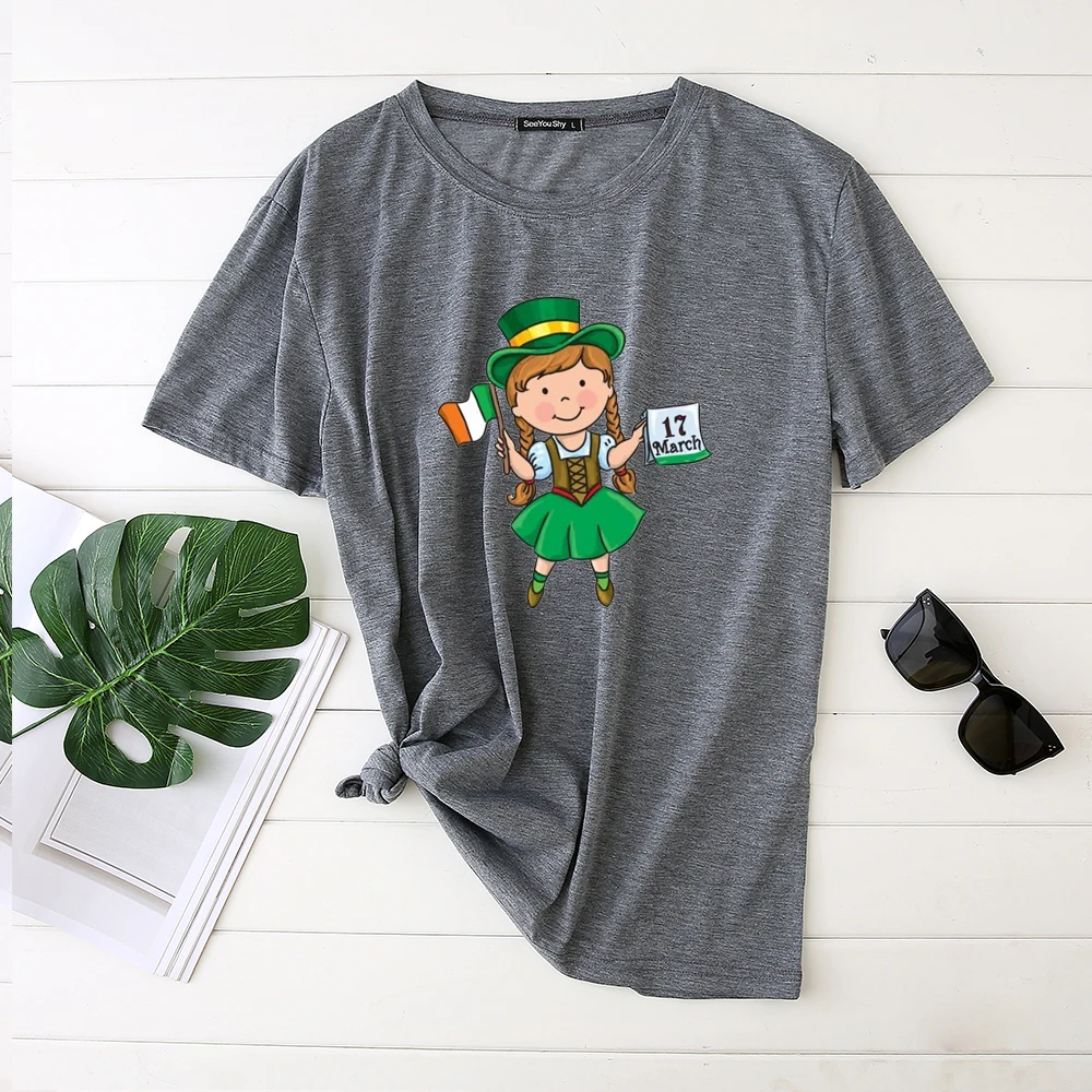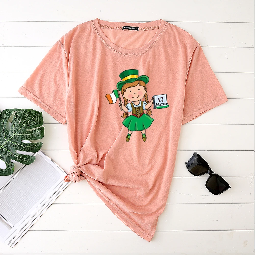 Девушка держит ирландское флаг календарь печатных День Святого Патрика женские футболки 2021 Графические футболки женская уличная повседневная обувь размера плюс