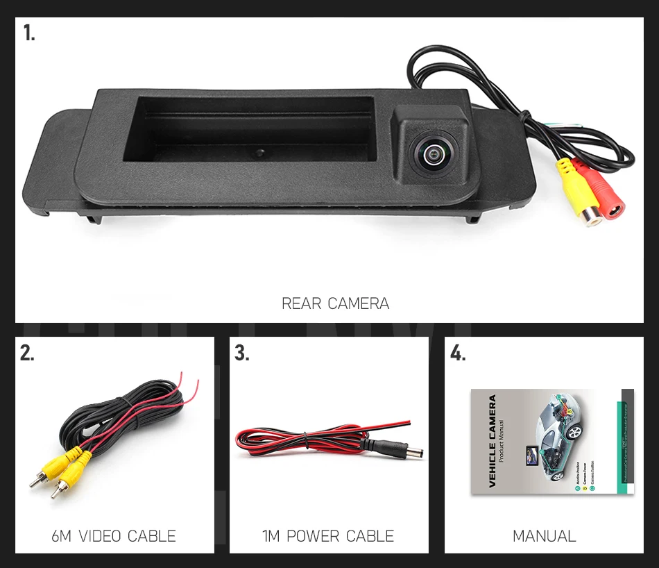 1. Задняя камера2. Коробка для посылка3. Видео кабель (6 м)4. Кабель питания5. Руководство пользователя