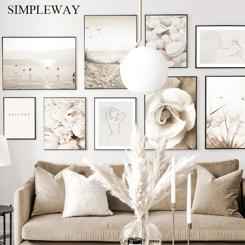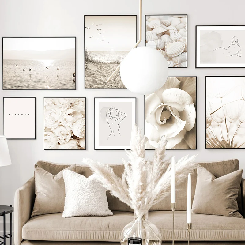 Скандинавский Пляжный Пейзаж, холст, постер, розовый океан, волны, ...