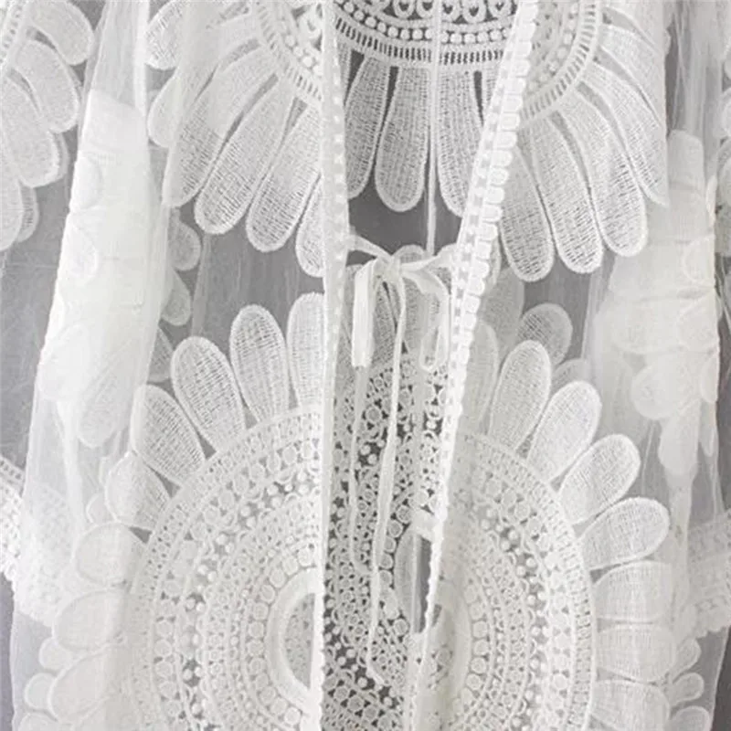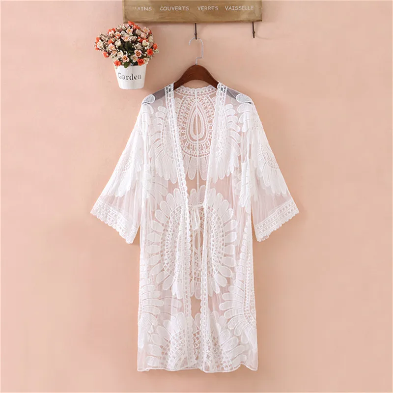 Новинка, летний купальник, кружевная ажурная Пляжная накидка на бикини, женские топы с рукавом 34, Пляжное Платье, белая пляжная туника, рубашка