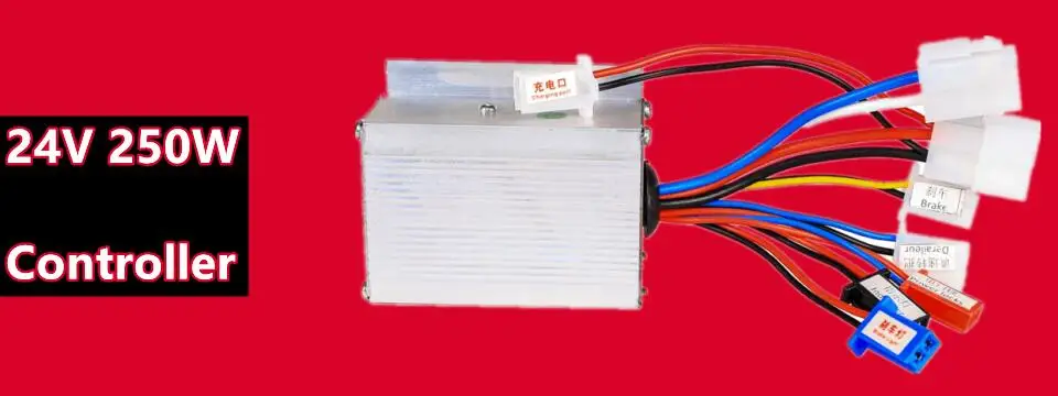 Подходящее напряжение: 24 В Мощность мотора: 250 Вт Предел тока: 15A +-1A Короткие Voltege защиты: 31,5 V +-0,5 V Интерфейс: 1. Красный и черный (большой кабель): подключение батареи 2. Желтый и синий: соединения двигателя 3. Красный и синий: клавишный переключатель (Блокировка питания) (Если нет дверных замков питания, красное соединение с синим) 4. Желтый и черный: тормоз 5. Красный и желтый: тормозной светильник 6. Красный и черный (маленький кабель): световой светильник 7. Красный, черный и синий: регулятор скорости 1-4 в (дроссельная заслонка) (Красный: + 5 В, черный: - , синий: сигнальный провод) 8. Красный и черный (маленький кабель): зарядное устройство