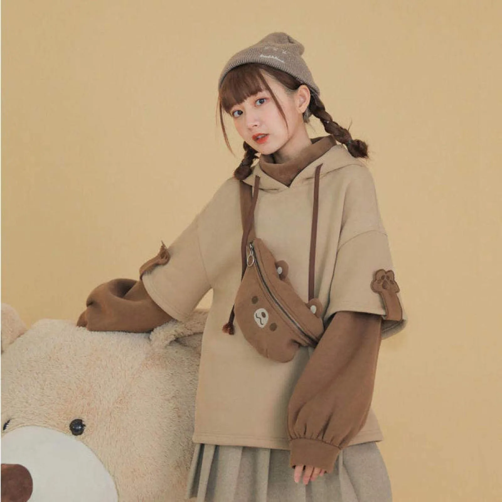 Худи женское в стиле Харадзюку, оверсайз с длинными рукавами и круглым вырезом, одежда в Корейском стиле с аниме медведем, уличная одежда в стиле kpop, Осень-зима