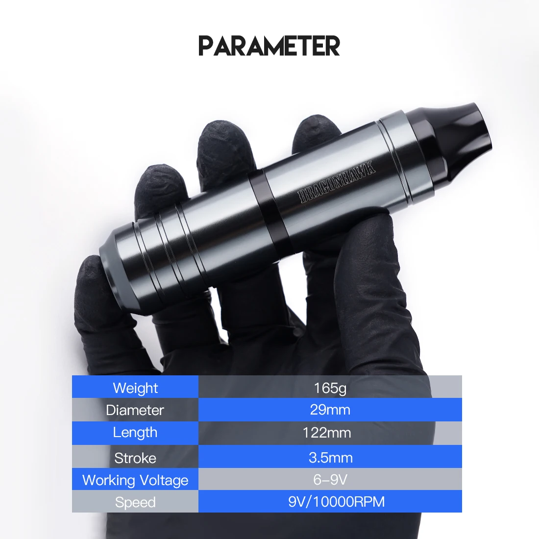 Спецификация машины 1, скорость двигателя: 9 В/10000 об/мин 2, размер: 29 мм * 122 мм 3, длина хода: 3,5 мм 4, Вес: 165 г 5, двигатель: двигатель без сердечника Мягко и плавно переносит чернила на кожу, подходящую для всех типов кожи. Предназначен для точности и точности Что делает его идеальным для художников, ищущих полный контроль во время процедур татуировки. Прочная машина с ручкой Гибкий и легкий дизайн для любого стиля Спецификация источника питания