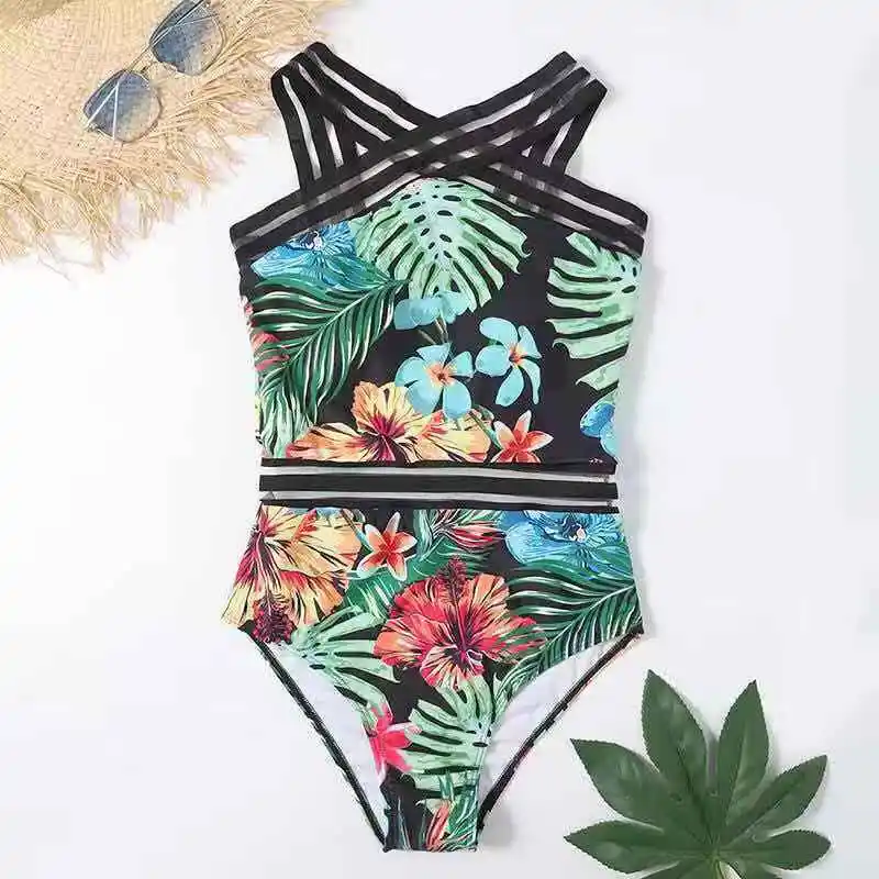 Женский слитный купальник в полоску с принтом листьев, сексуальный купальник с цветочным принтом, без рукавов, с высокой талией, плотная костюм с v-образным вырезом