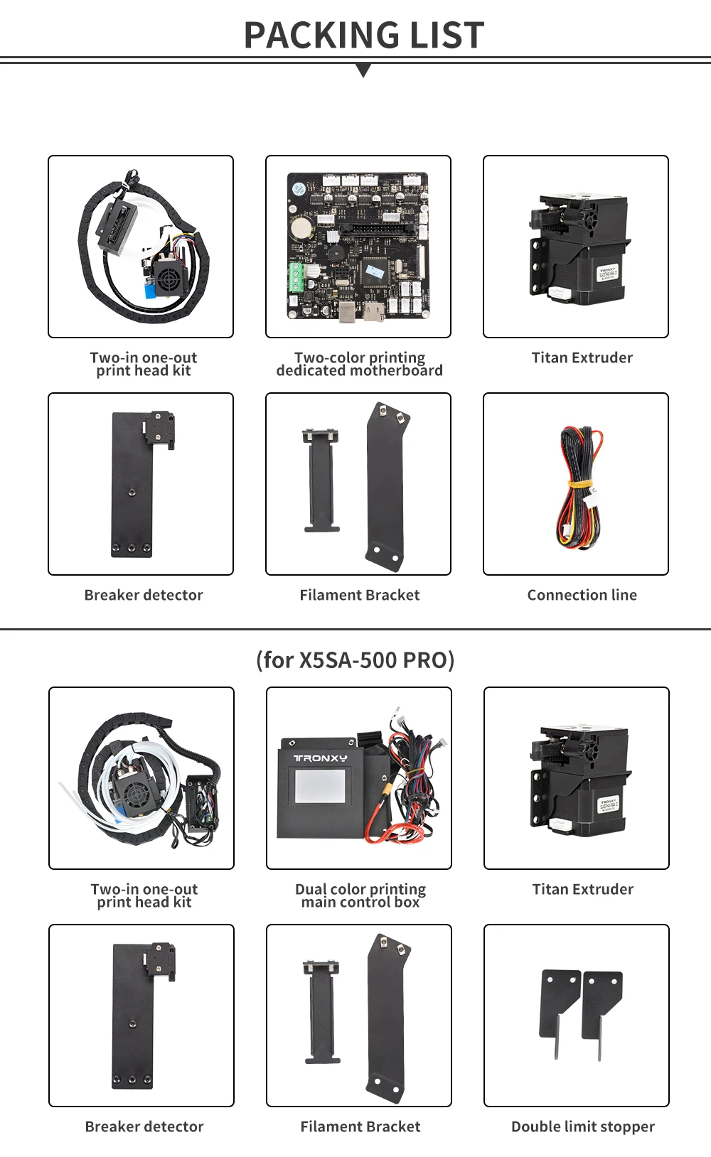 X5SA PRO и X5SA-400 PRO упаковочный лист 1. Двухцветная печатная специальная материнская плата 2.Two- in one-out комплект печатающей головки 3. Экструдер Titan 4. Детектор брекера 5. Кронштейн нити 6. Соединительная линия X5SA-500 PRO упаковочный лист 1. Двухцветная печатная Основная коробка управления 2.two-in one-out комплект печатающей головки 3. Экструдер Titan 4. Детектор брекера 5. Кронштейн нити 6. Двойная ограничительная пробка