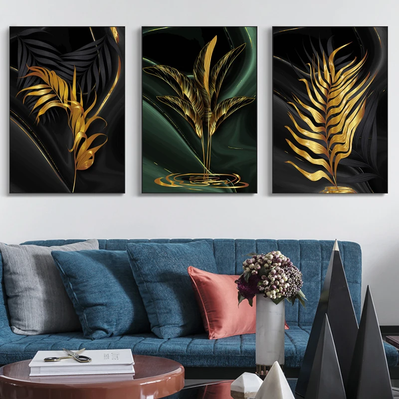 Настенная картина Золотые и зеленые листья в скандинавском стиле