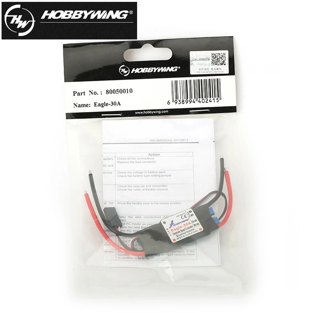 Название бренда: HobbywingНаименование товара: Орел 30A матовый ESCВыход: непрерывный 30A, Burst 40A до 10 секундВходное напряжение: 2-3 ячейки литиевая батарея или 4-10 ячеек NiCd/NiMh батареяВыводного чипа: 1A / 5 вольт постоянного тока (Линейный режим)Частота ШИМ: 2 кГцРазмер: 45x21x8 ммВес: 21 гОсобенности:Функция безопасности: независимо от положения дроссельной заслонки, двигатель не будет вращаться после подключения батареи.Настройки тормоза: функция тормоза может быть включена или отключена соединительным соединителем.Тип батареи: Тип батареи может быть выбран перемычкой.Защита от отключения низкого напряжения для продления срока службы батареи.Защита от перегрева для продления срока службы ESC.Защита от потери сигнала дроссельной заслонки для безопасного полета.Преимущества:Расширенный микропроцессор.Совместим с литиевой батареей и никелевым аккумулятором.Программируемый пользователем с помощью соединители перемычек.