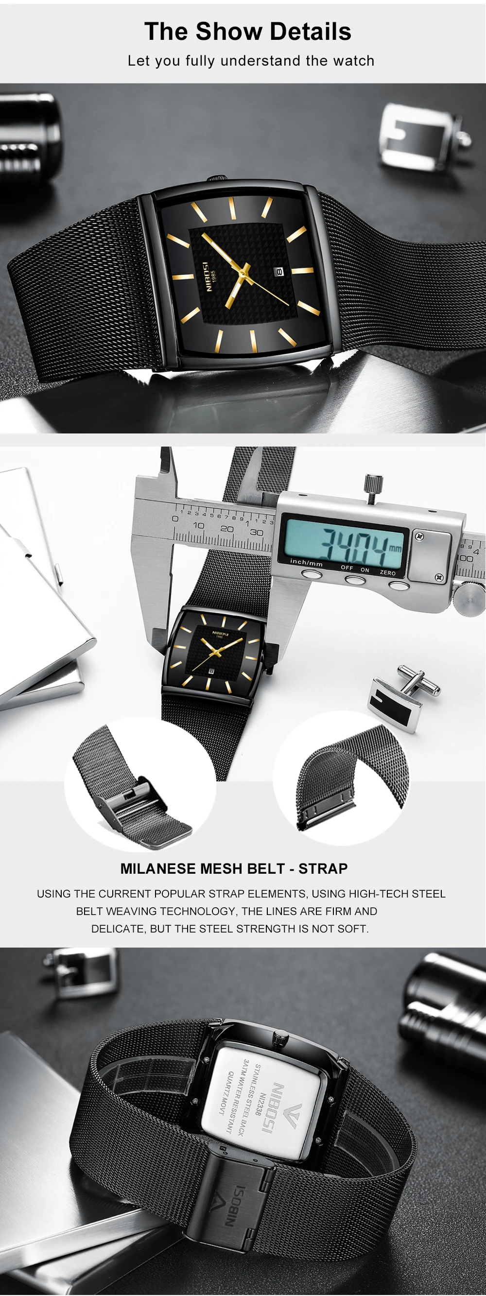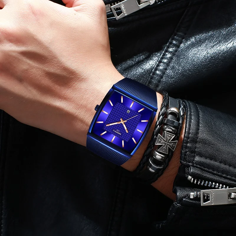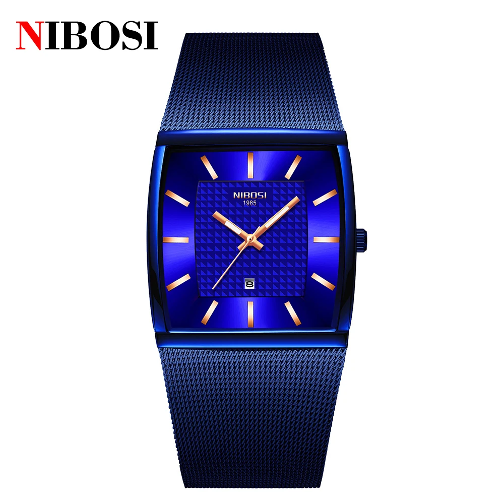 NIBOSI 2021 квадратные часы мужские черные золотистые синие сетчаты...