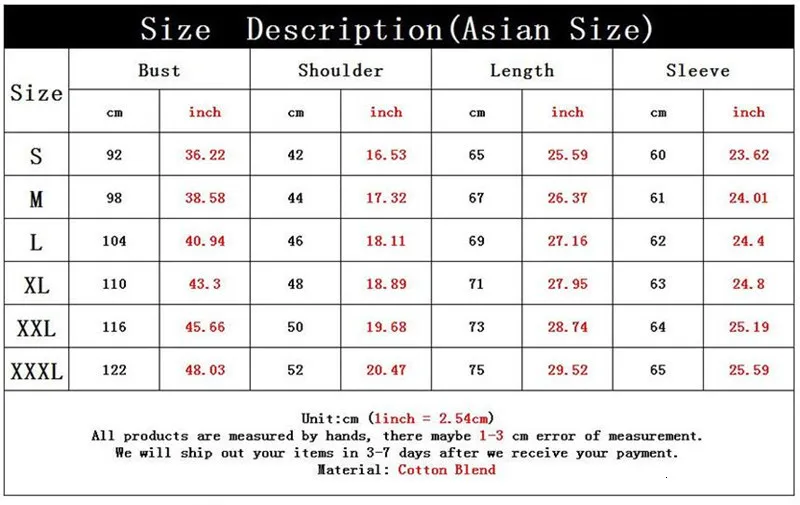 1. Дорогой друг, спасибо за подарки в нашем магазине. Не забудьте указать свое полное имя, подробный адрес, почтовый индекс, номер телефона. Чтобы они могли успешно получить посылка ЛКУ. 2. Размер нашей одежды меньше в Азии, чем в США и ЕС, например: Размер L США/ЕС = Азиатский размер XXL. Пожалуйста, измерьте размер в соответствии с одеждой, которую они обычно носят (не ваше тело), перед покупкой сверьтесь с таблицей размеров ниже, если ваши мерки ожидают двух размеров, Советуем выбрать самый большой размер. Если она не уверена в размере, пожалуйста, оставьте мне сообщение о ее весе и росте, я могу дать вам предложение. Примечание: возможны отклонения в 0,5-1 дюйм из-за ручного измерения. (1 дюйм = 2,54 см) цвет реального элемента немного отличается от изображения выше из-за разных экранов компьютера, спасибо за понимание.
