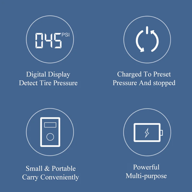 Обеспечивает максимальное инфляционное давление 150 фунтов на квадратный дюйм, может полностью быстро надувать плоскую велосипедную шину в 45-75 с до 5 кг-7 кг, автомобильная шина в 5-8 минутах от 0 до 230 кПа.√ Функция автоматического отключения:Останавливается при достижении заданного давления.√ Портативный и компактный дизайн:Достаточно маленький, чтобы взять с собой и поместить в чемодан или рюкзак.√ Цифровой ЖК-дисплей:С большим и четким ЖК-дисплеем, вы будете иметь надлежащую видимость в любом состоянии.√ Яркий светодиодный светильник:Помогает вам четко видеть в чрезвычайных ситуациях ночью, также полезно для надувания ночью, ремонта в темноте или прогулок ночью.√ Цифровой монитор давления в шинах:Контролирует давление в шинах в любое время, устраняет опасности и быстро реагирует на неожиданные ситуации√ Встроенный литиевый аккумулятор:Поставляется с мощной перезаряжаемой литиевой батареей емкостью 2000 мАч, которая может использоваться в качестве внешнего аккумулятора для устройств android и iOS или цифрового оборудования.√ Совместимость с различными насадками:Французский адаптер воздушного сопла x1, газовая игла x1√ Мощный, многоцелевой:Подходит для различных предметов для надувания, таких как шины для pro-bike, автомобильные шины для домашнего использования, шины для мотоциклов, шины для электровелосипедов, шары, кольца для плавания, надувные игрушки и другие надувные изделия. Экономит энергию и время. Облегчают жизнь.