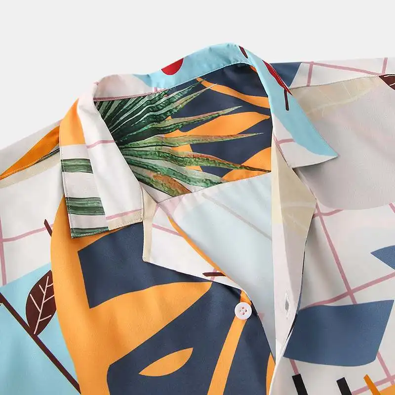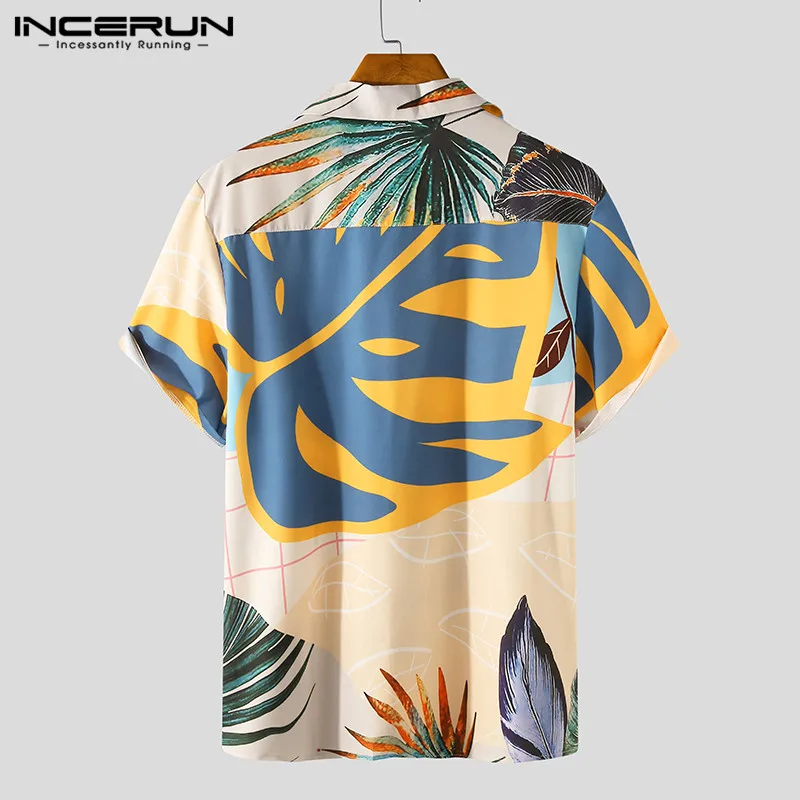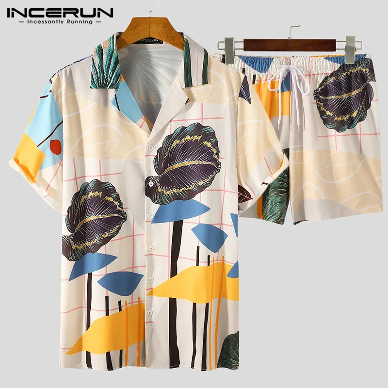 Комплект INCERUN мужской с принтом, рубашка с коротким рукавом, воротником с лацканами и шорты с кулиской, свободный пляжный костюм в гавайском стиле с цветочным принтом, 5XL, на лето