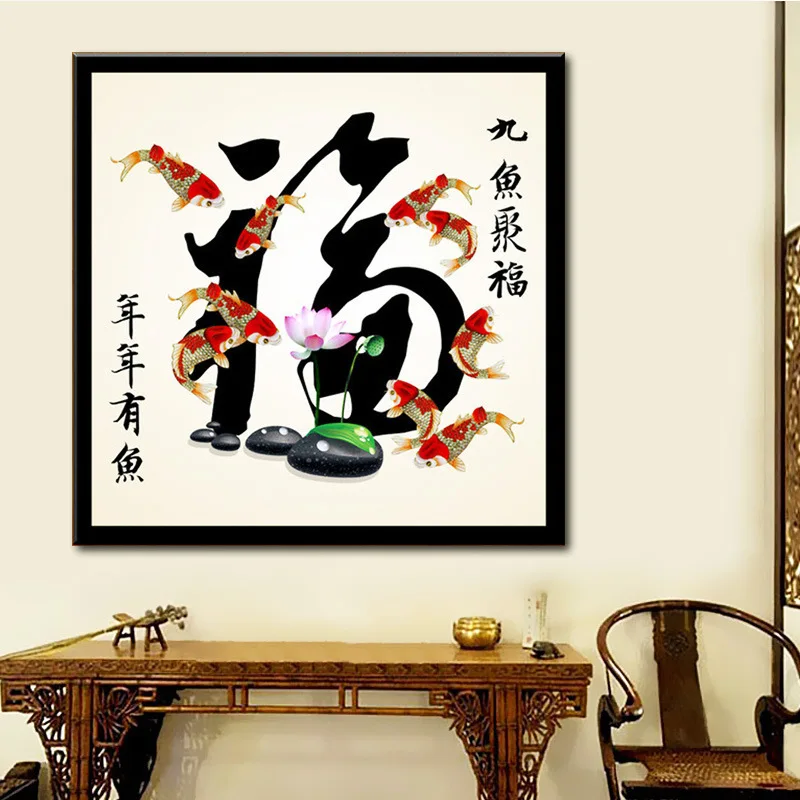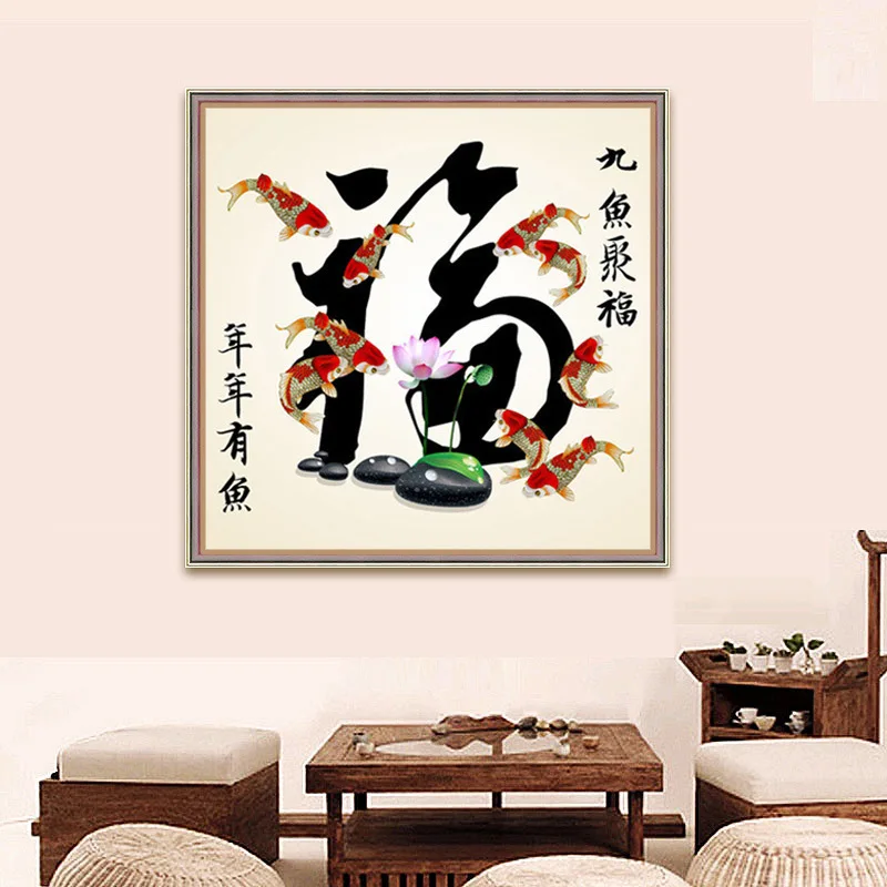 Алмазная вышивка, китайский иероглиф FU, 9 Карпов, лотос, каллиграфия, процветание на новый год, полная картина, вышивка крестиком