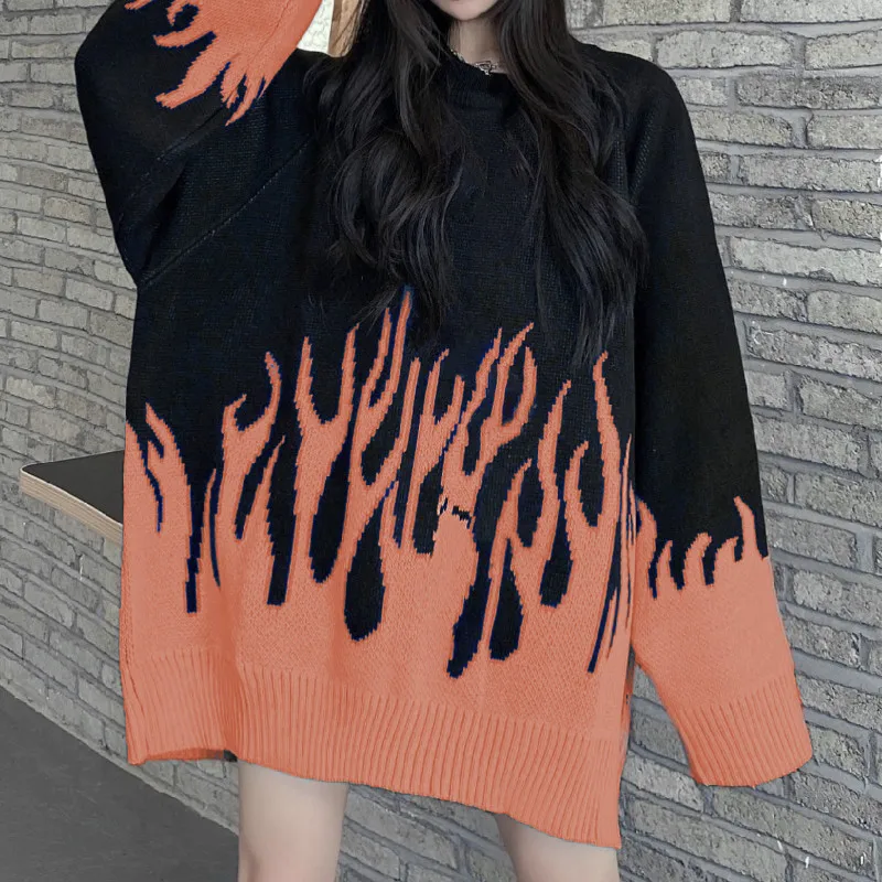 Женский модный длинный наряд, пуловеры, свободный женский свитер в стиле Харадзюку, вязаный Топ, весенне-осенние свитера с пламенем