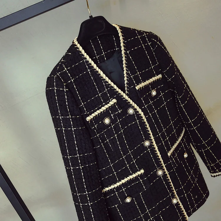 Женское шерстяное пальто в клетку, Роскошный дизайнерский твидовый жакет в стиле ретро, с V-образным вырезом и широкой талией