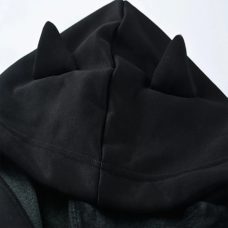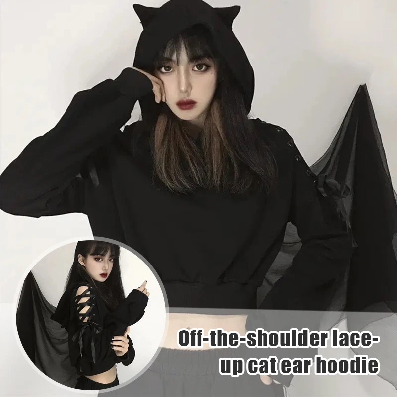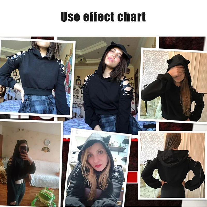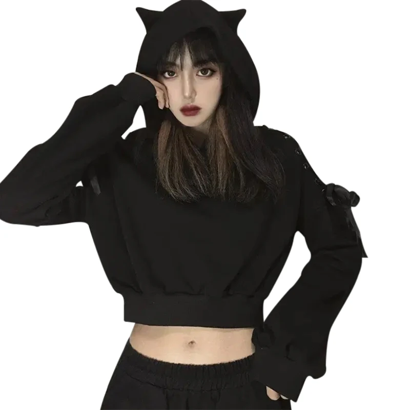 Короткая Толстовка с кошачьими ушками в стиле Харадзюку, готический панк, милый уличный Свободный пуловер, Черный свитшот для женщин, L