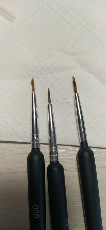 Пришли отлично запакованные, все целы, очень удобные. Из минусов - небольшой запах + самая большая кисть всё ещё довольно маленькая. Но этот набор и позиционируется как миниатюрный. Удобные держатели, но у меня обычно в китайских кистях расшатывается наконечник, поэтому я их сразу заматываю изолентой. Тут немного не ясно к чему приматывать. Но и не шатается ничего, сидит уверенно на клею + зажиме. Посмотрим, сколько протянут) Кисти мягкие, для акварели самое оно. Воды вбирают немного.