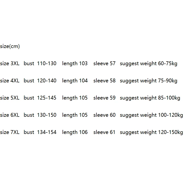 Размер 6XL обхват груди 130-150 длина 105 рукав 60 рекомендуемый вес 100-120 кг