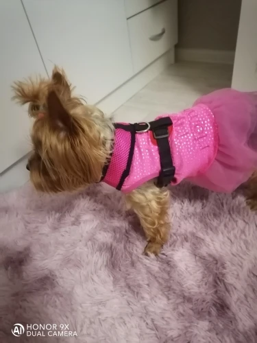harnais conforme par contre je pensais qu'il y avait un autre clip sur la partie arriere du corps; en effet il faut enfiler a l'animal le harnais ce qui n'est pas évident délai france rapide