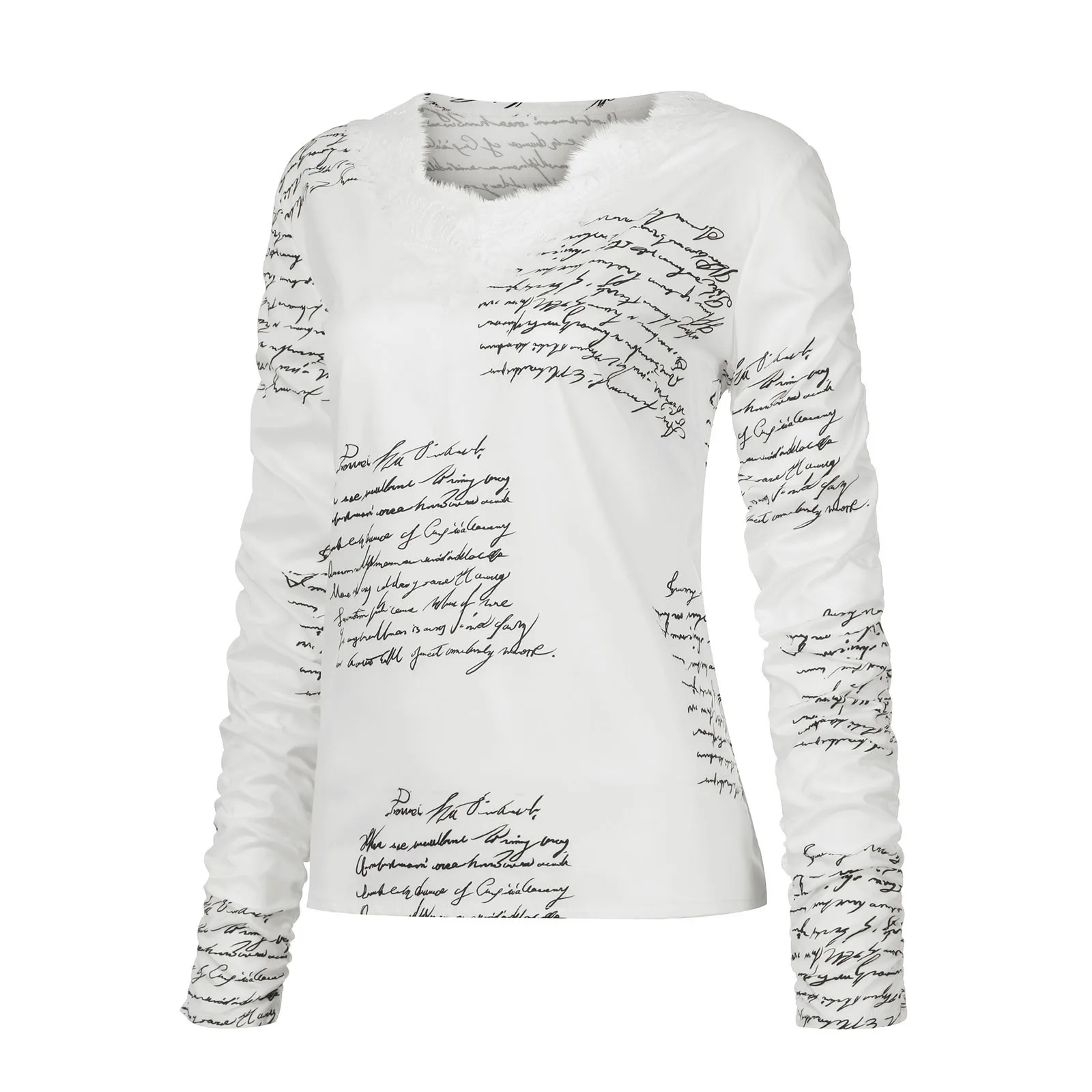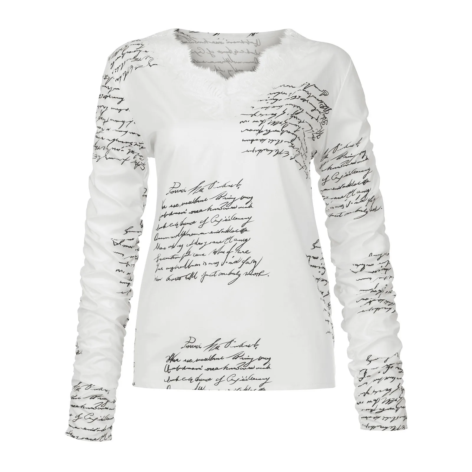 Женские кружевные Элегантные блузки 40 #, зимние комбинированные модные повседневные офисные рубашки с V-образным вырезом и буквенным принтом, с длинным рукавом, 2020