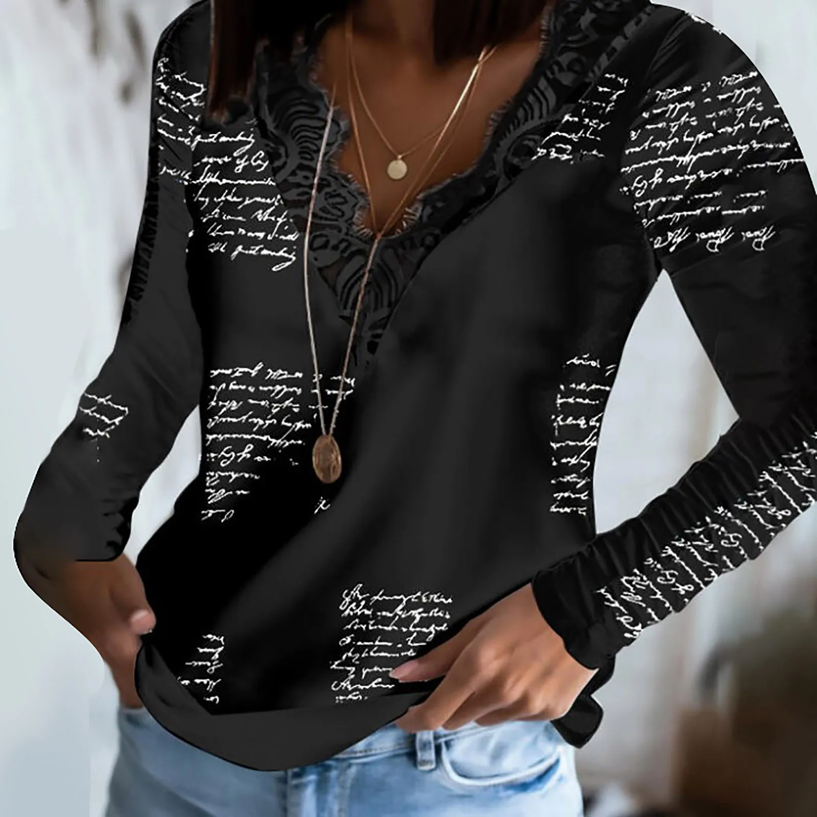 Женский зимний комбинированный модный кружевной топ с V-образным вырезом и кружевным принтом, повседневный Топ с длинным рукавом