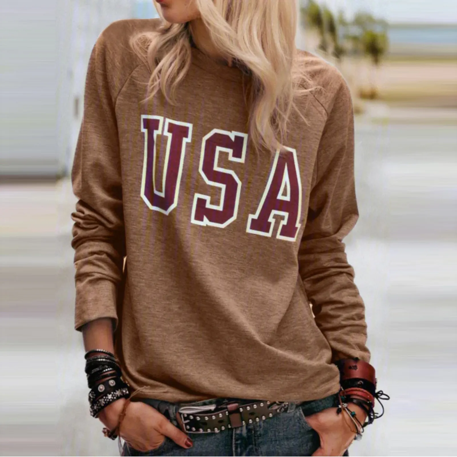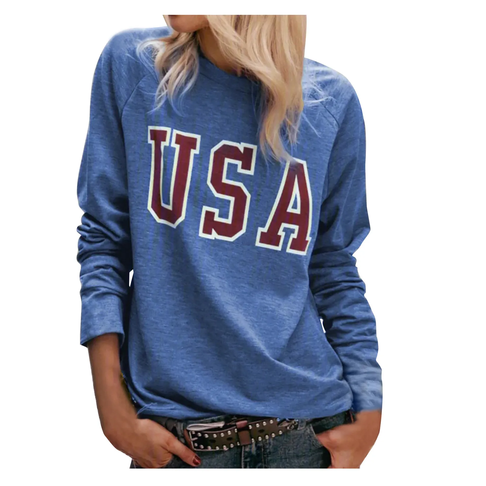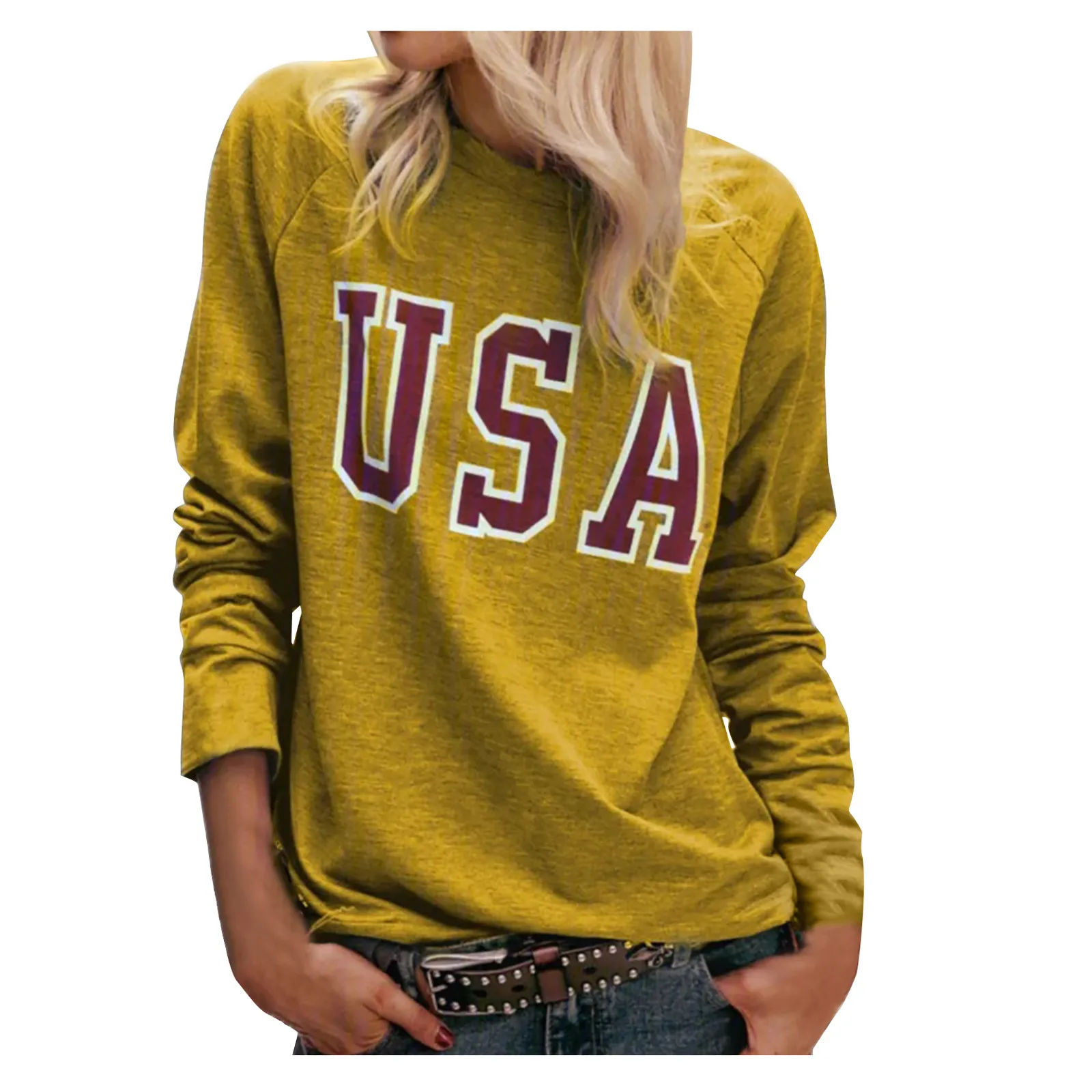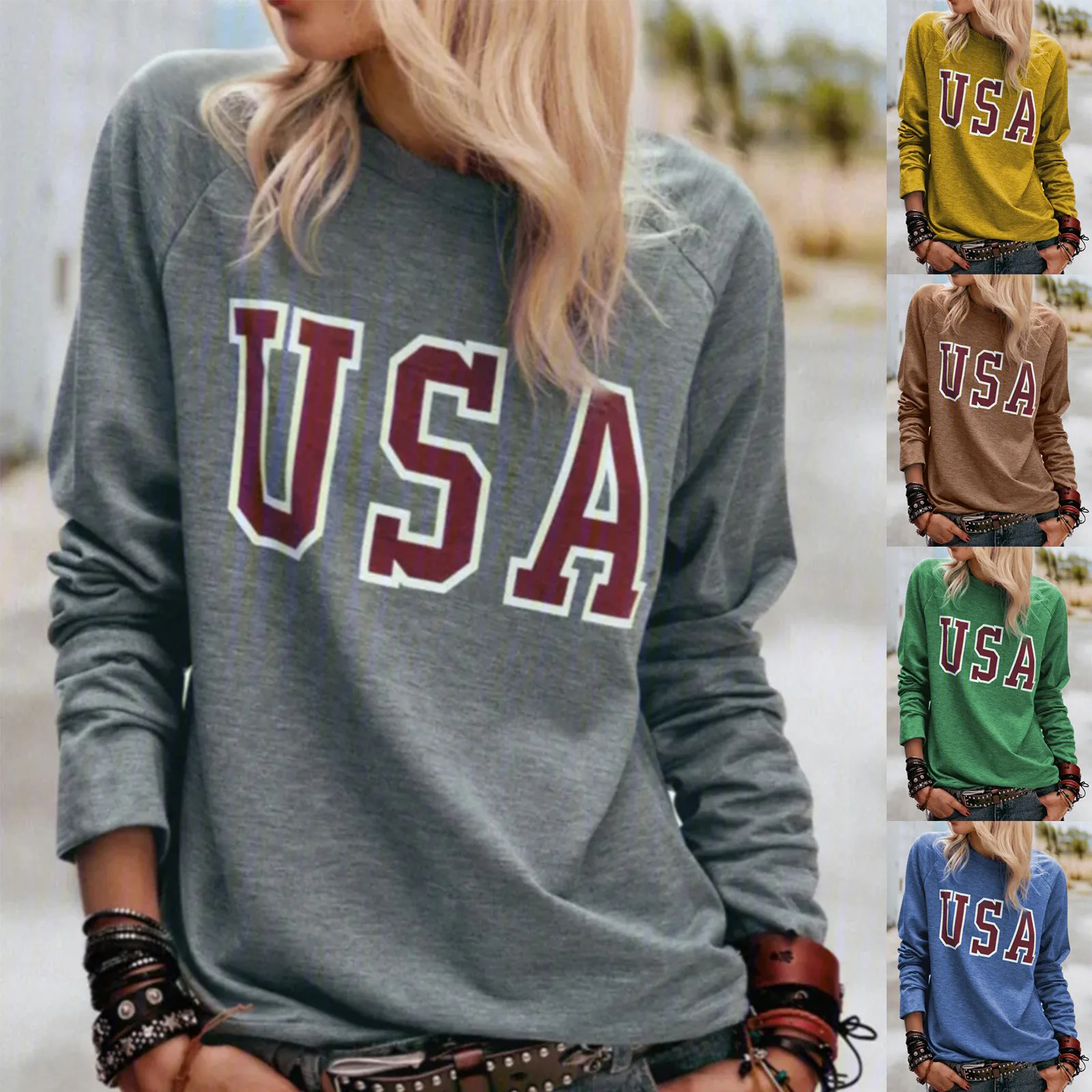 Модные Женские Футболки большого размера 40 #, повседневный Свободный пуловер с круглым вырезом и длинным рукавом, с буквенным принтом США, топы