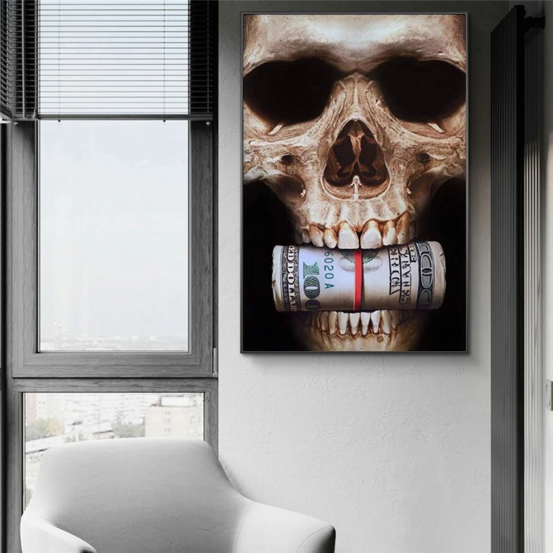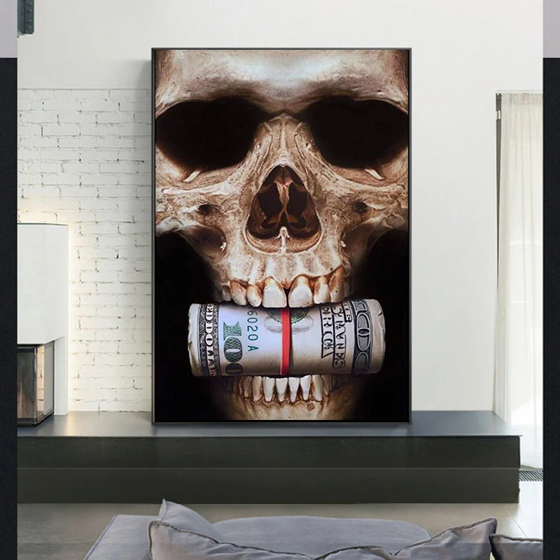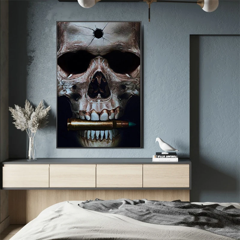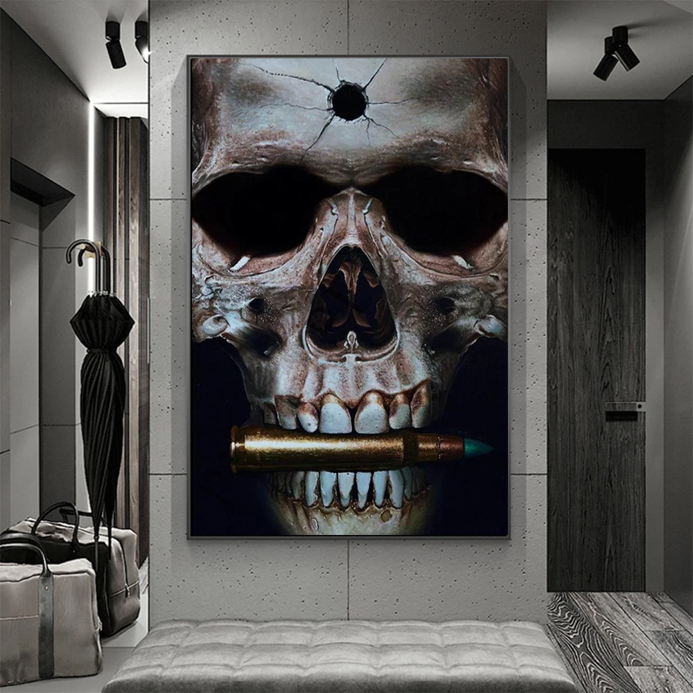 Настенная живопись, Абстрактная Картина на холсте, черный и золотой череп с пулями, крутые плакаты и печать, Картина Настенная для украшения комнаты