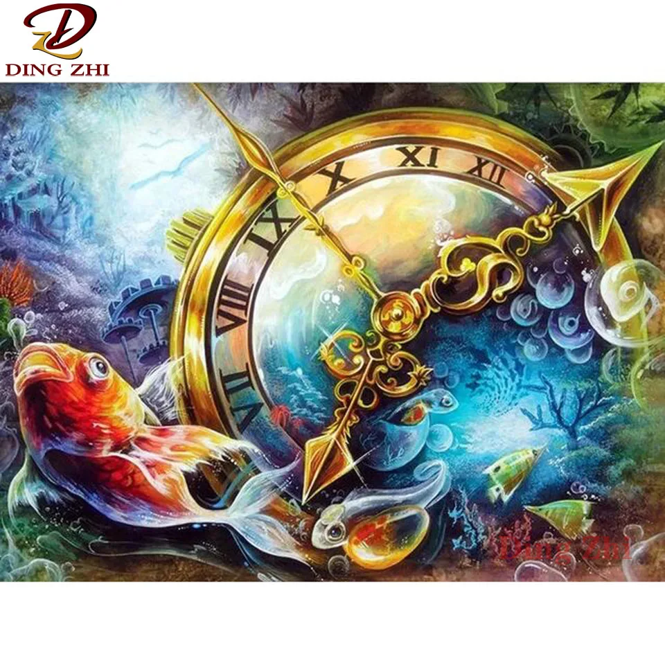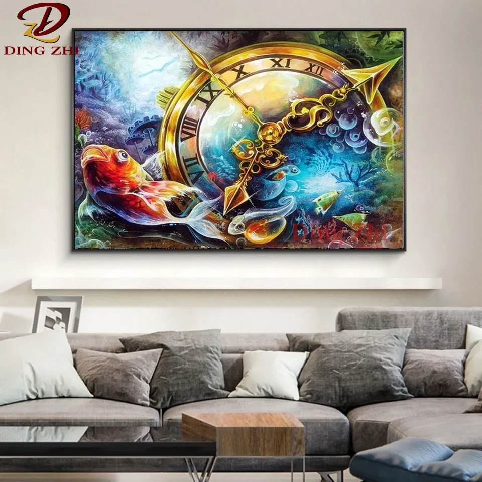 Diy Алмазная Картина Koi Ретро часы полный квадрат 5D крестиком наборы Алмазная мозаика вышивка круглая дрель подводный мир
