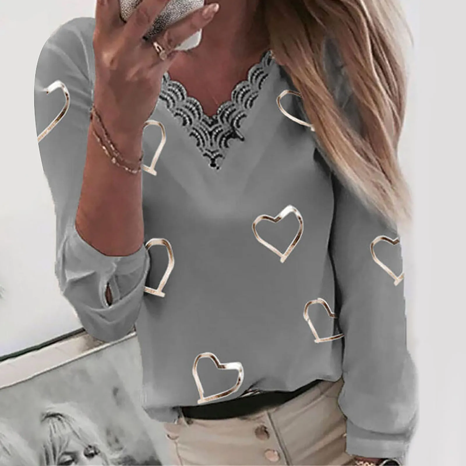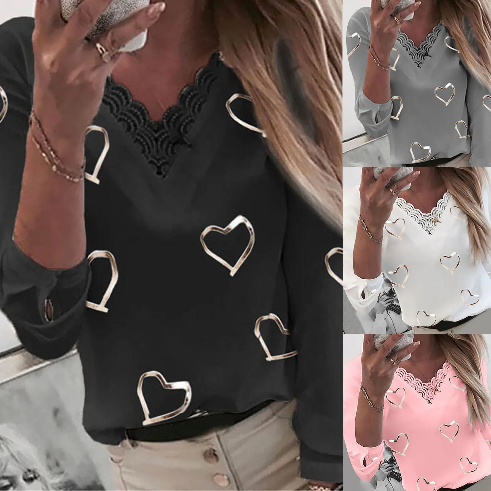 40 # Женские рубашки кружева принт в виде сердечек, с v-образным вырезом, топ с длинными рукавами; Элегантные весенние туфли с ремешками в стиле Харадзюку размера плюс блузка рубашка женская