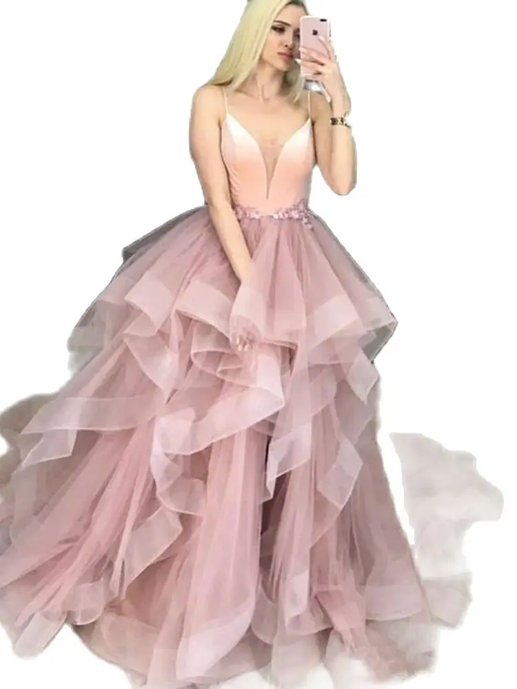 Уникальные Розовые тюлевые пышные трапециевидные платья MYYBLE для Quinceanera с V-образным вырезом Аппликации на тонких бретелях Многоярусные оборки платье для выпускного вечера на заказ