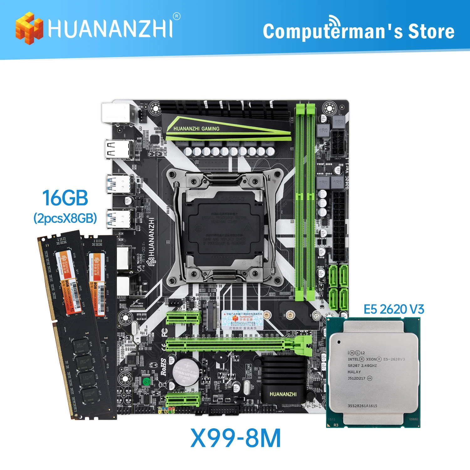 Материнская плата HUANANZHI X99 8M D4 в комплекте с процессором Intel XEON E5 2620 V3, память 2*8 ГБ DDR4 NON-ECC 2400, память M.2 NVME USB3.0 ATX