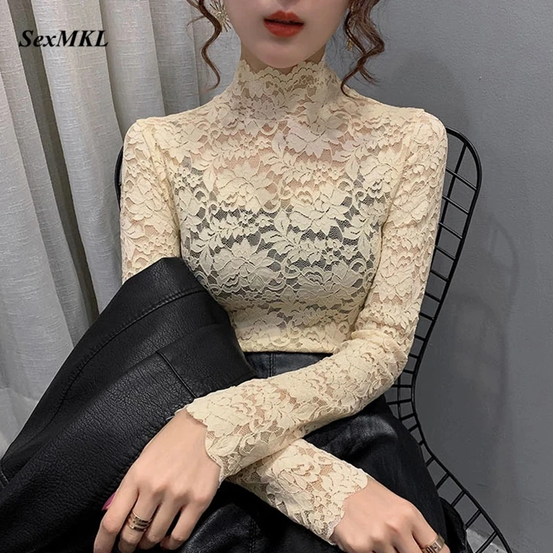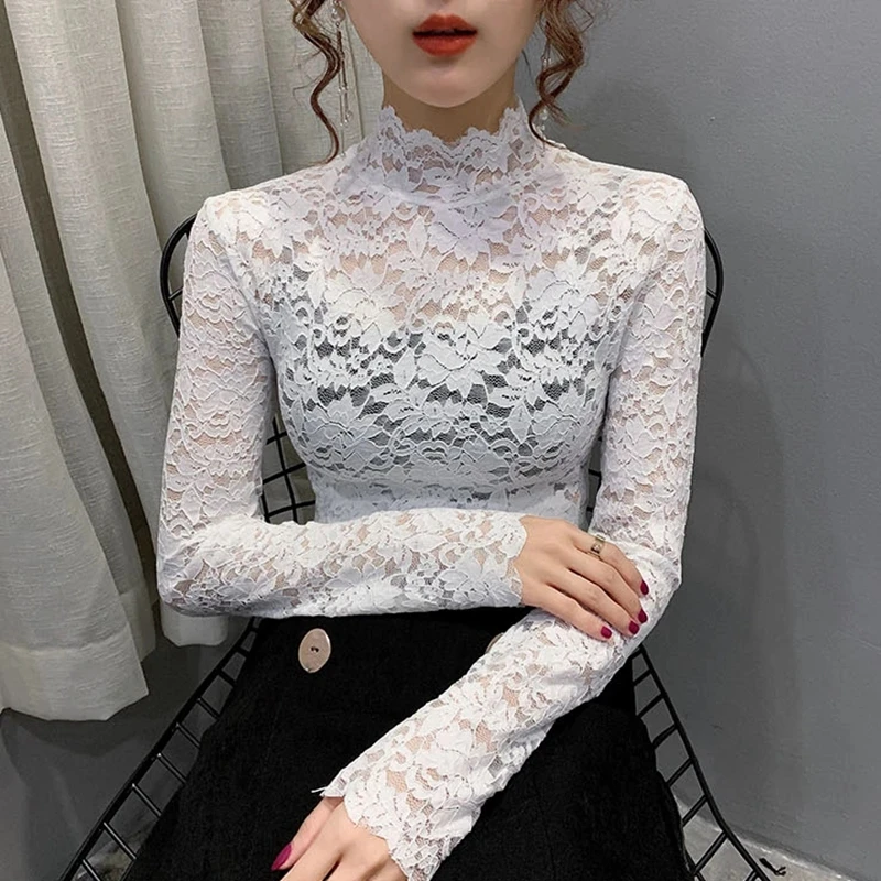 Женские сексуальные топы и блузки 2021, модные летние повседневные кружевные рубашки с длинным рукавом, женская одежда в Корейском стиле, Женская белая блузка