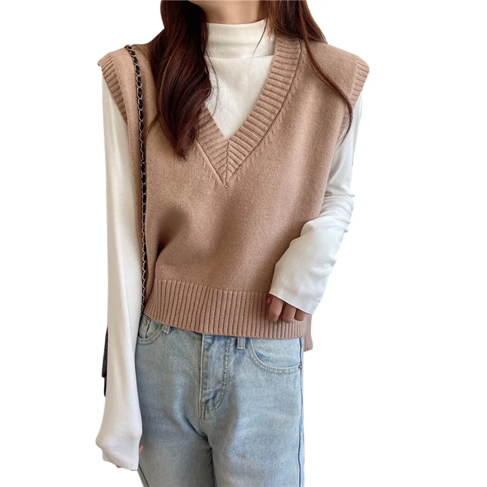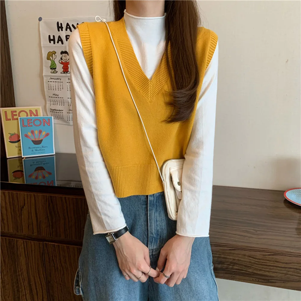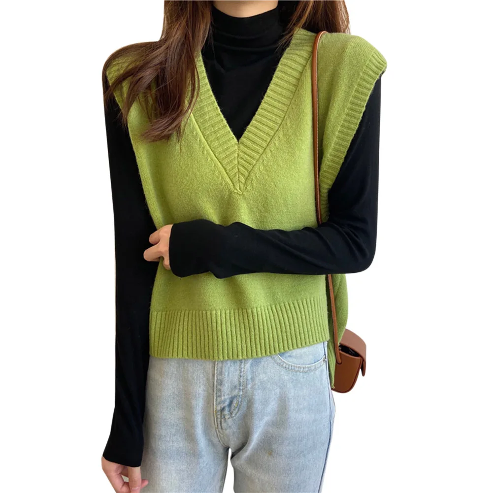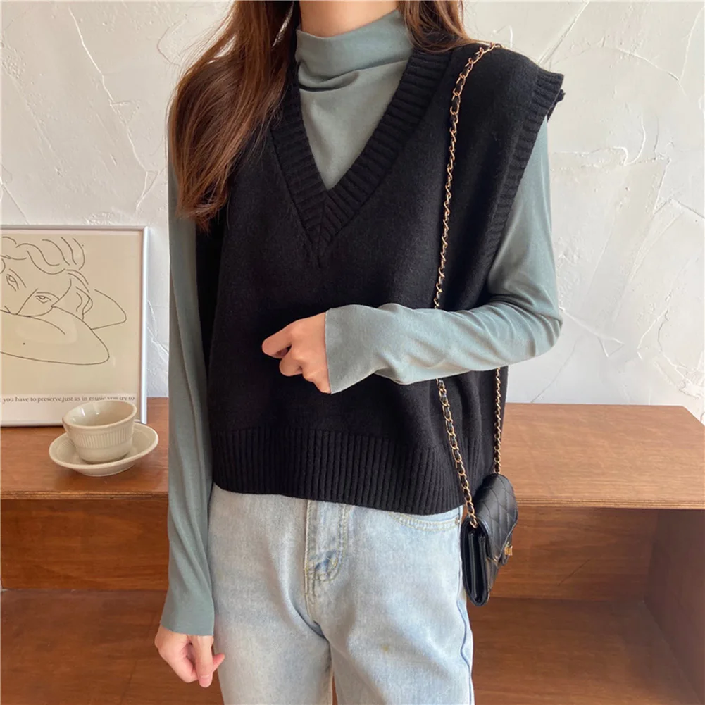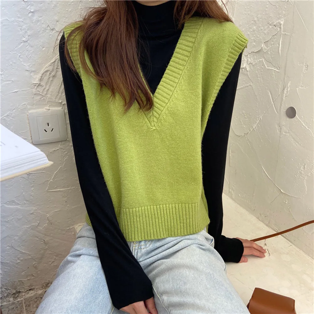Женский вязаный жилет, Свободный пуловер без рукавов в Корейском стиле, Однотонный свитер для отдыха, элегантный пуловер с V-образным вырезом на осень и зиму