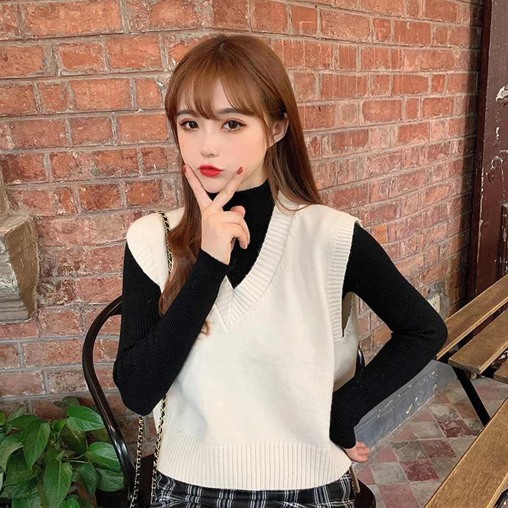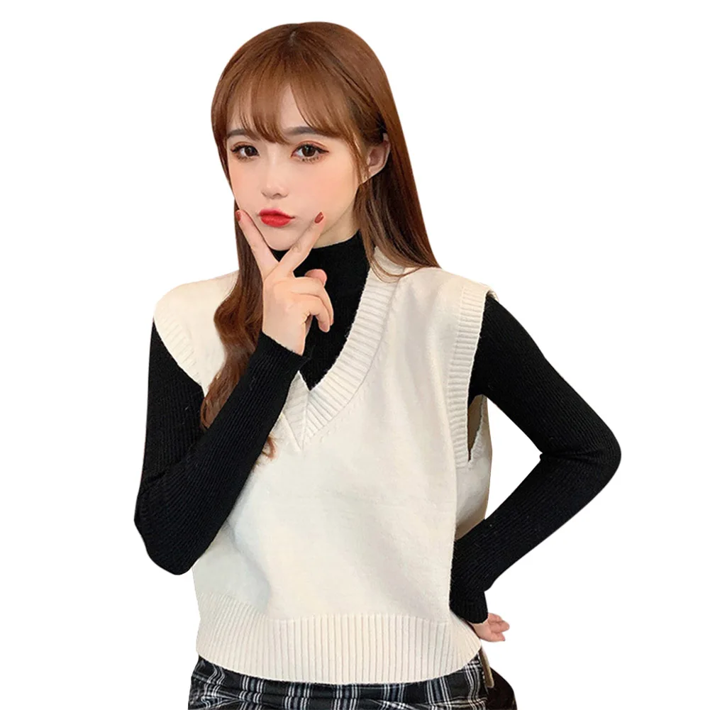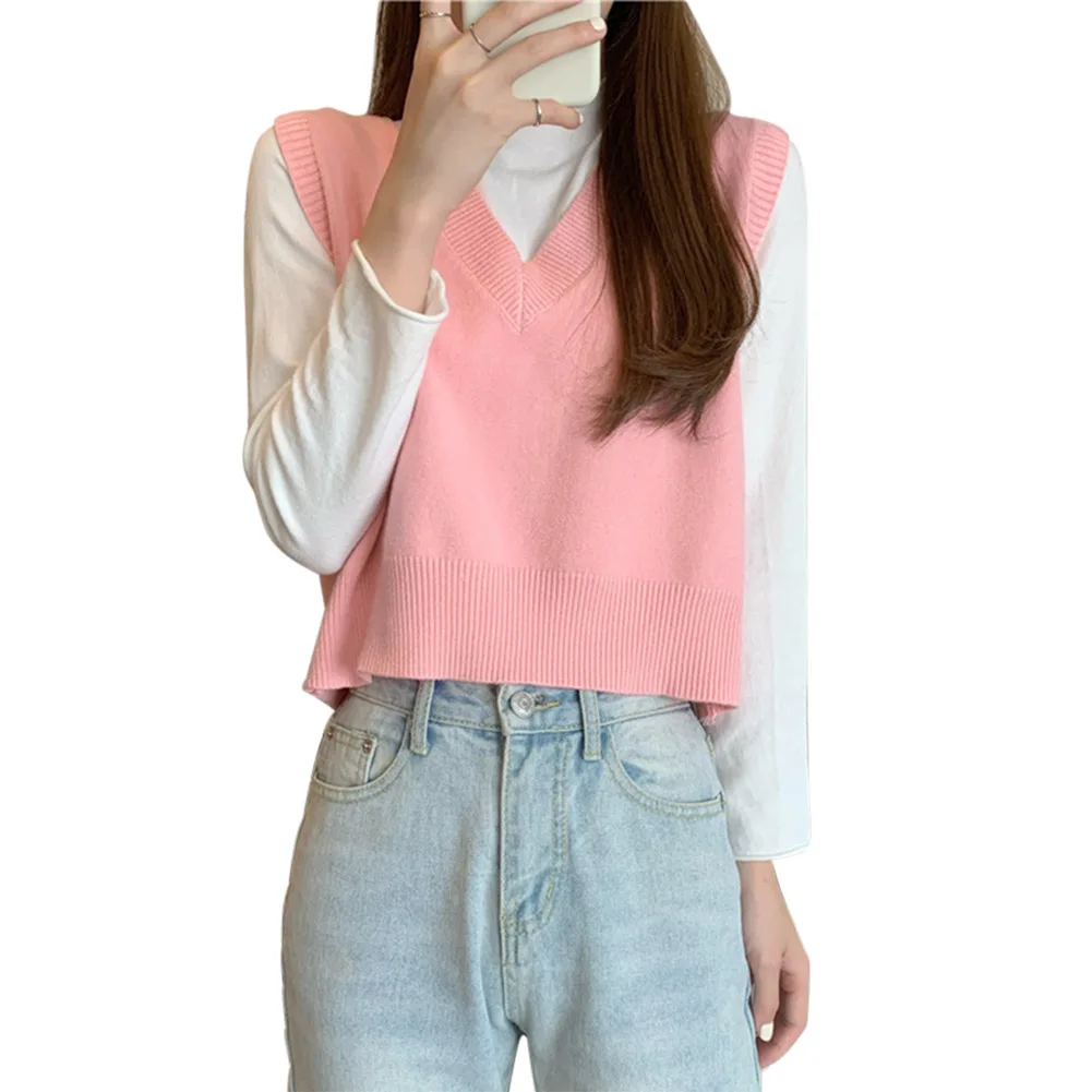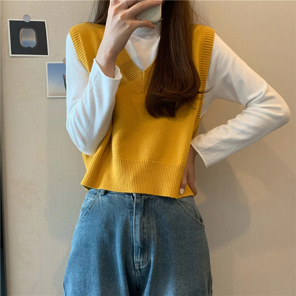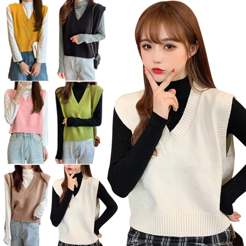 Женский вязаный жилет, Свободный пуловер без рукавов в Корейском стиле, Однотонный свитер для отдыха, элегантный пуловер с V-образным вырезом на осень и зиму