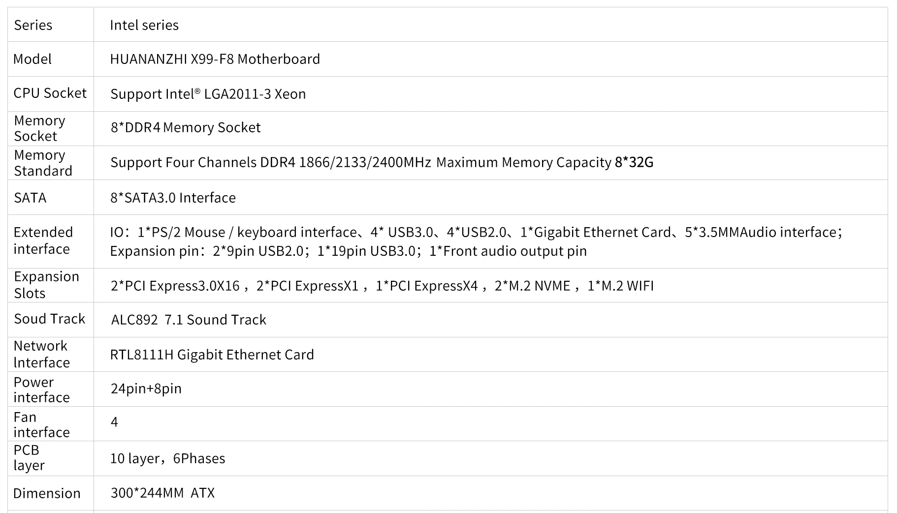 Модель: материнская плата HUANANZHI X99-F8ЦП гнездо: Поддержка Intel LGA2011-3 XeonРазъем памяти: 8 * DDR4 Разъем памятиСтандарт памяти: Поддержка четырех каналов DDR4 1866/2133/2400 МГц максимальная емкость памяти 8*32GИнтерфейс SATA:8 * SATA3.0Расширенный интерфейс: IO: 1 * PS/2 мышь/интерфейс клавиатуры, 4 * USB3.0, 4 USB2.0, 1 * гигабитная Ethernet карта, 5*3,5 MMAudio интерфейс;Расширительный штырь: 2*9pin USB2.0; 1*19pin USB3.0; 1 "передний аудиовыход pinСлоты расширения: 2 * PCI Express3.0X16 , 2 "PCI ExpressX1, 1 * PCI ExpressX4 , 2 * M.2 NVME, 1 * M.2 WIEIСетевой интерфейс: гигабитная Ethernet-картаИнтерфейс питания: 24pin + 8pinИнтерфейс вентилятора: 4pinСлой РCВ: 10 слоев, 6 фазРазмер: 300*244 мм ATX