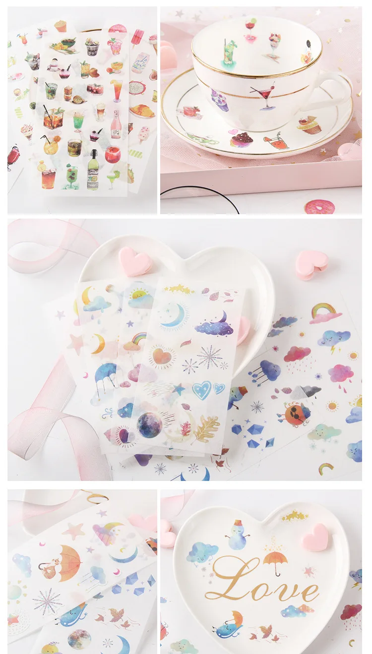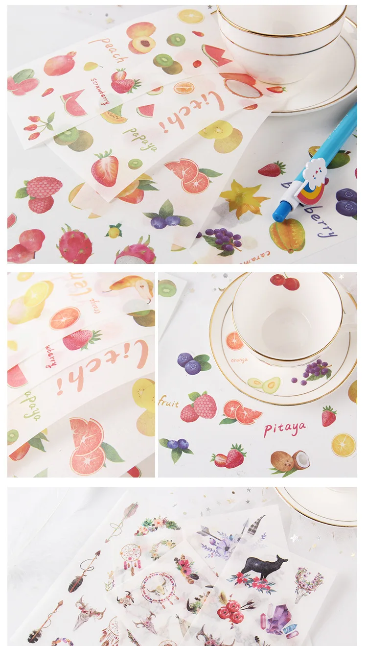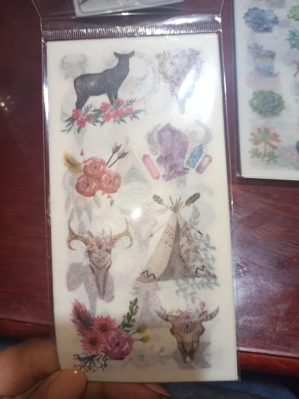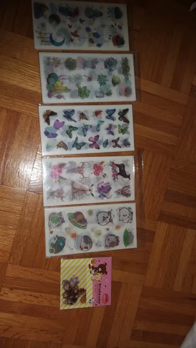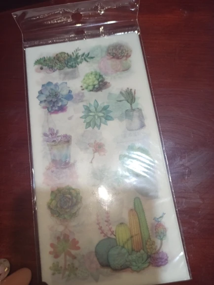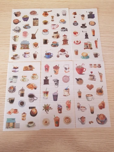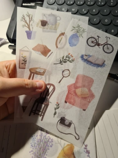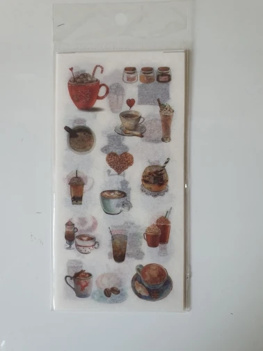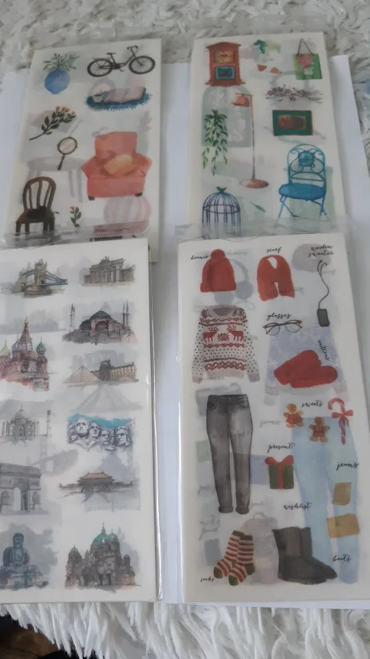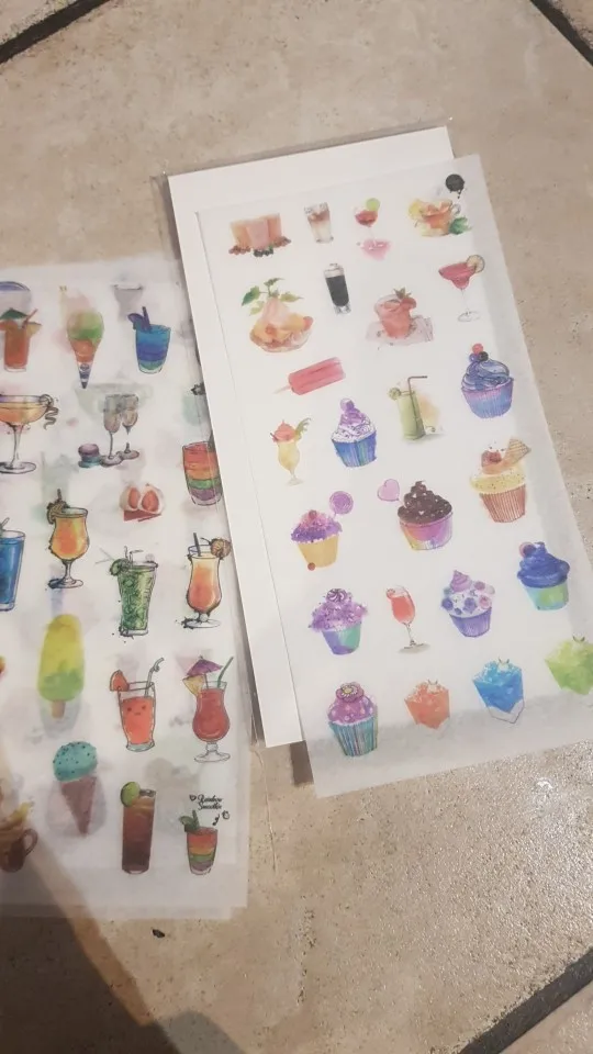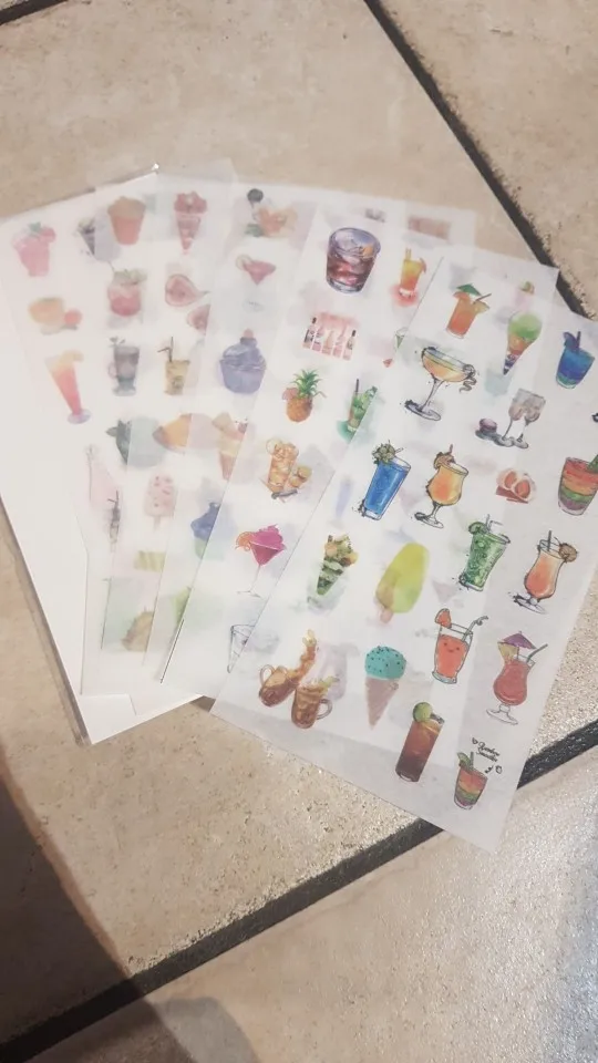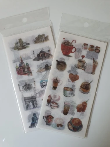 наклейки потрясающие! полупрозрачные, хорошо держатся на бумаге, рисунки яркие и четкие. всем советую!