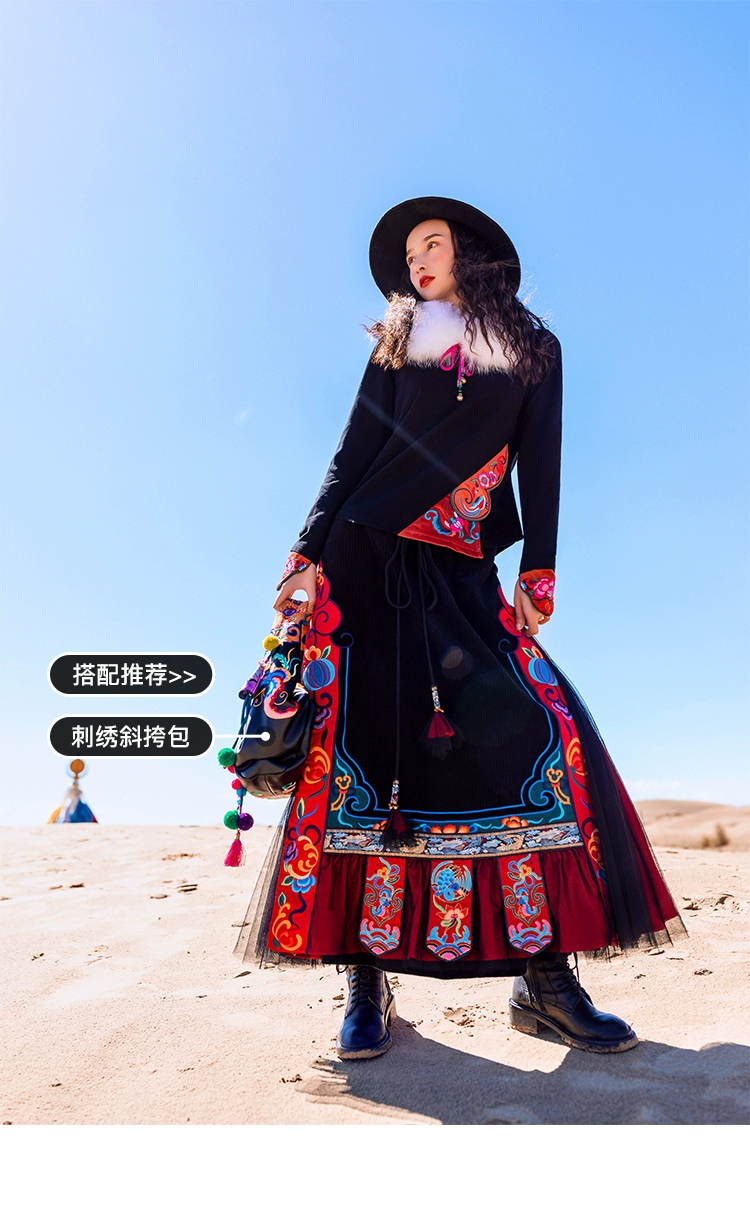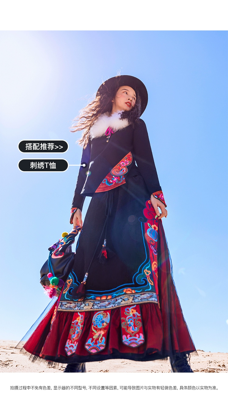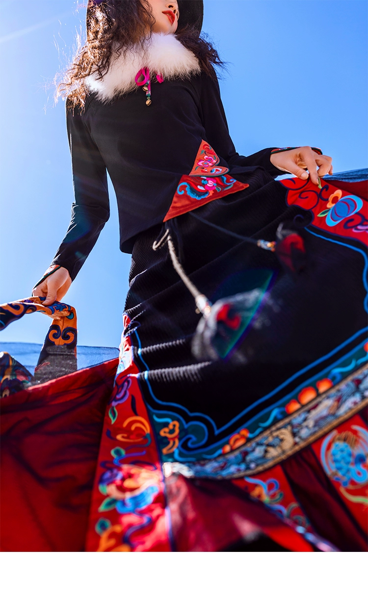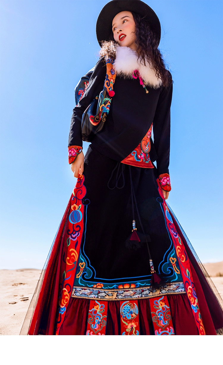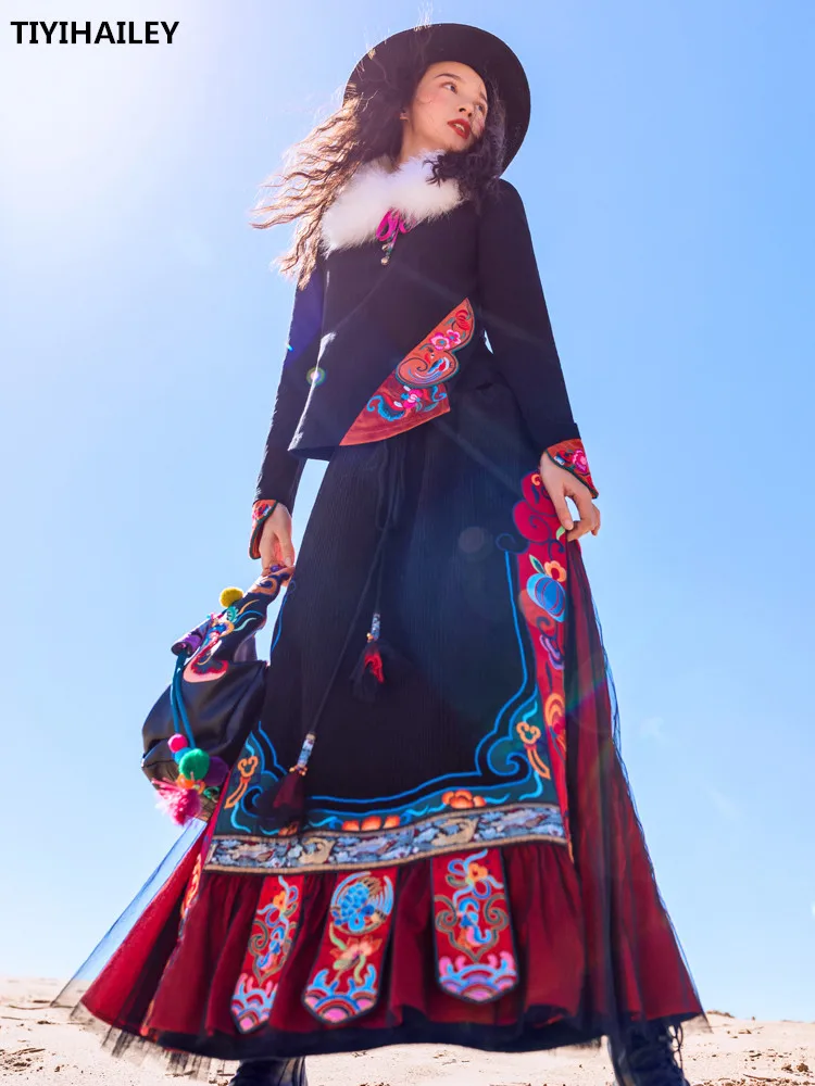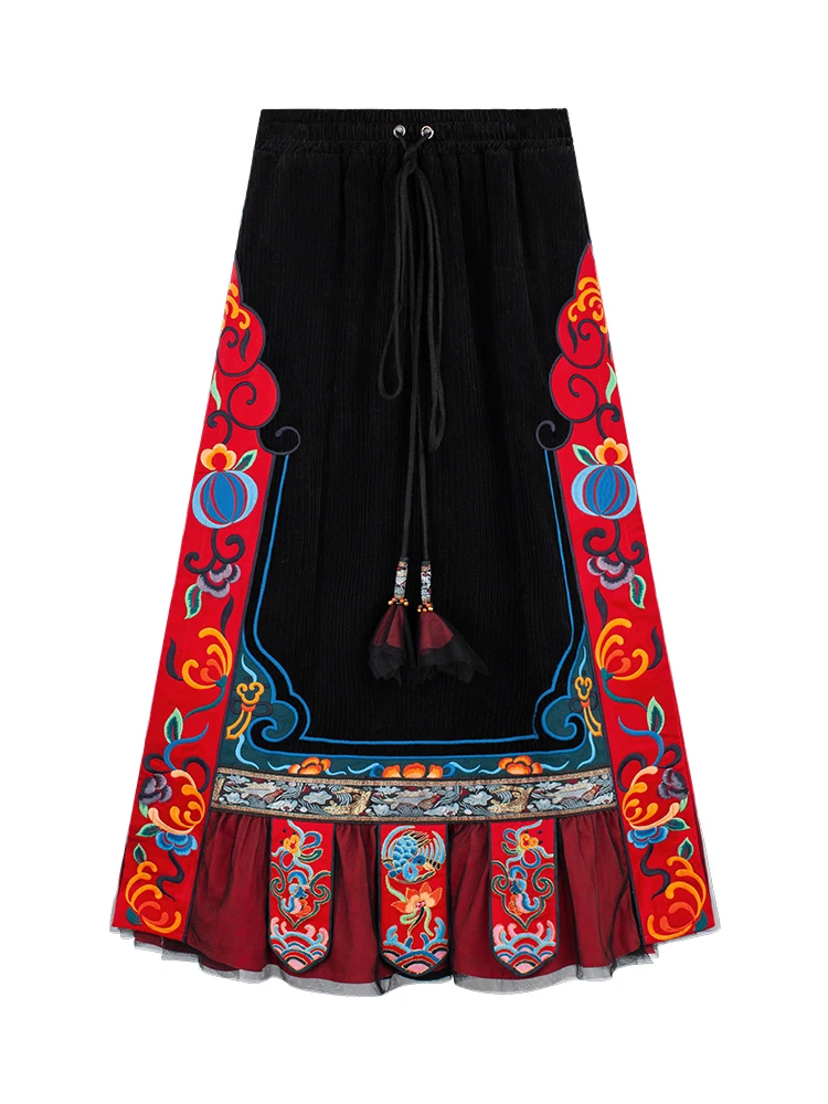 TIYIHAILEYбесплатная доставка; Сезон осень-зима; Плотная теплая длинная Вельветовая юбка макси с вышивкой и эластичной резинкой на талии в национальном китайском стиле