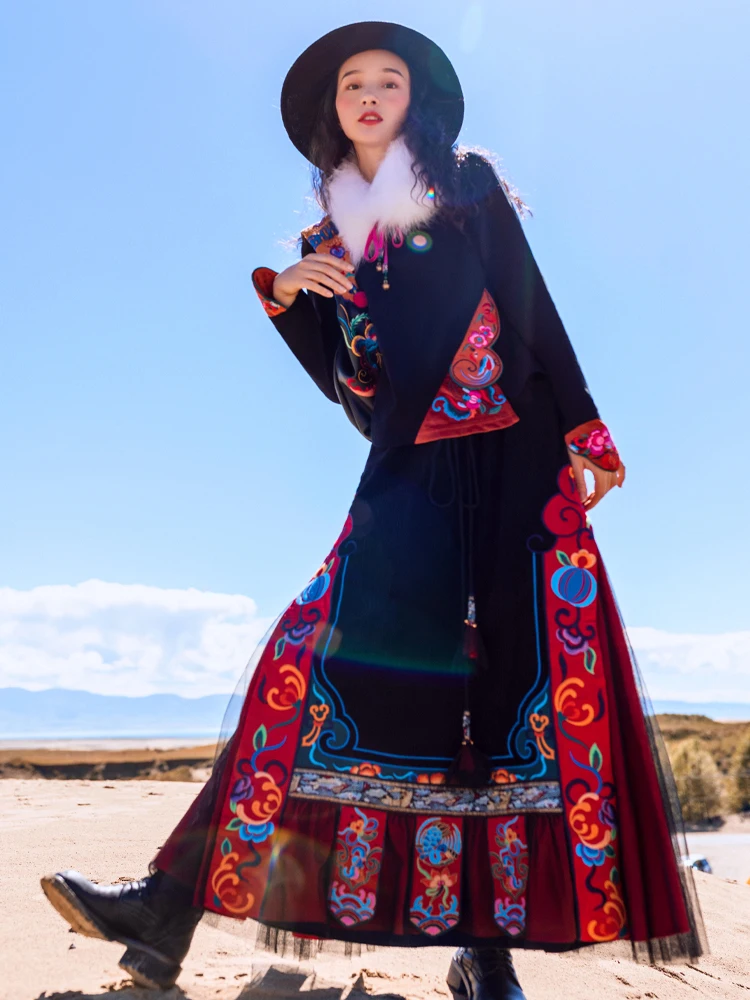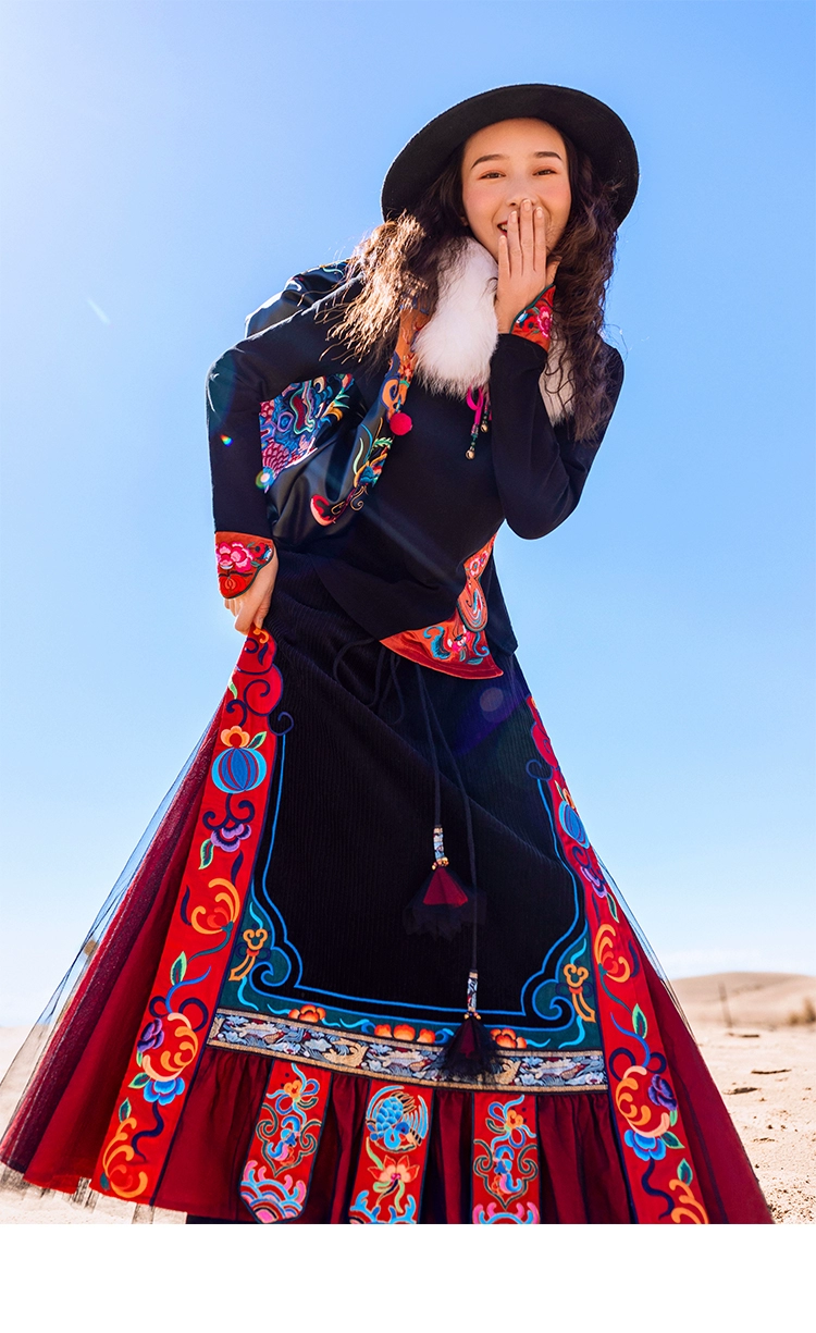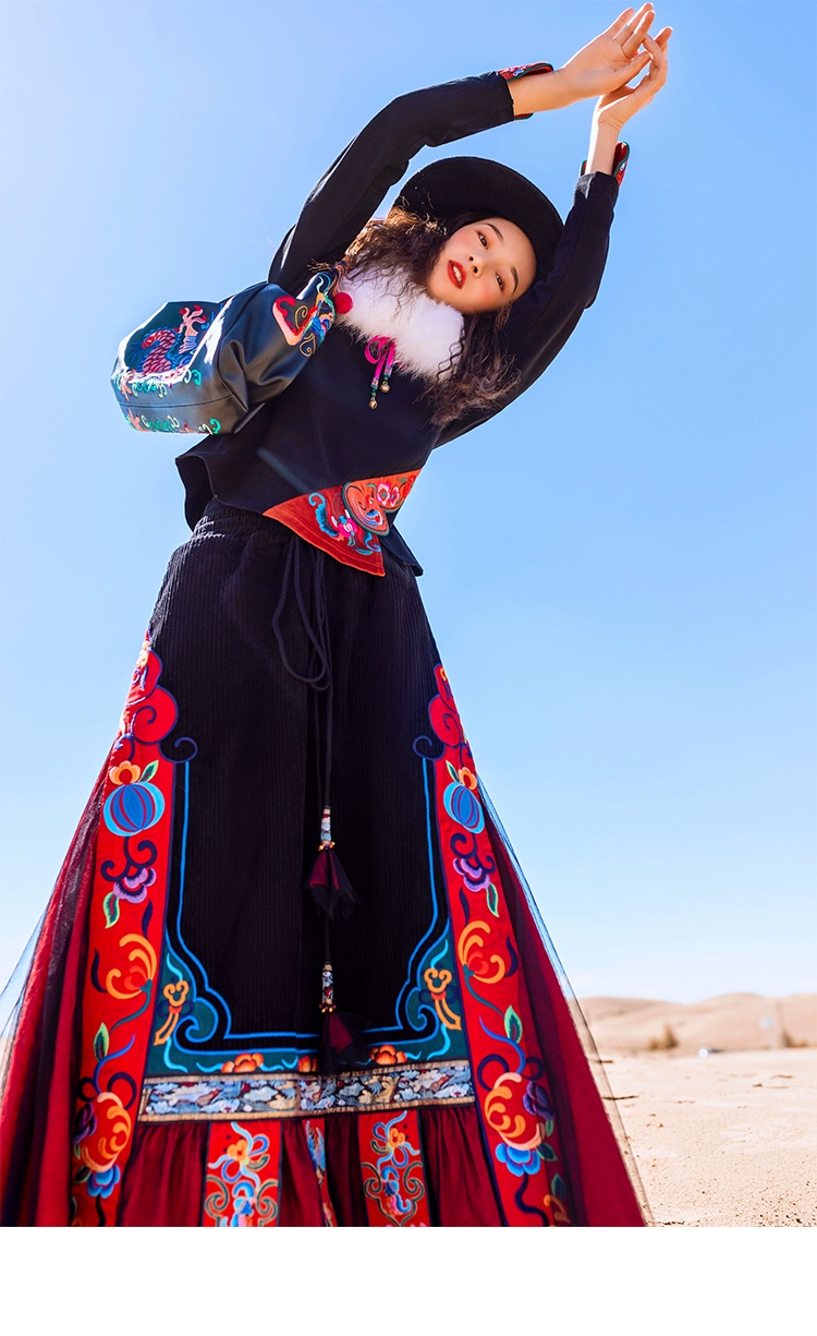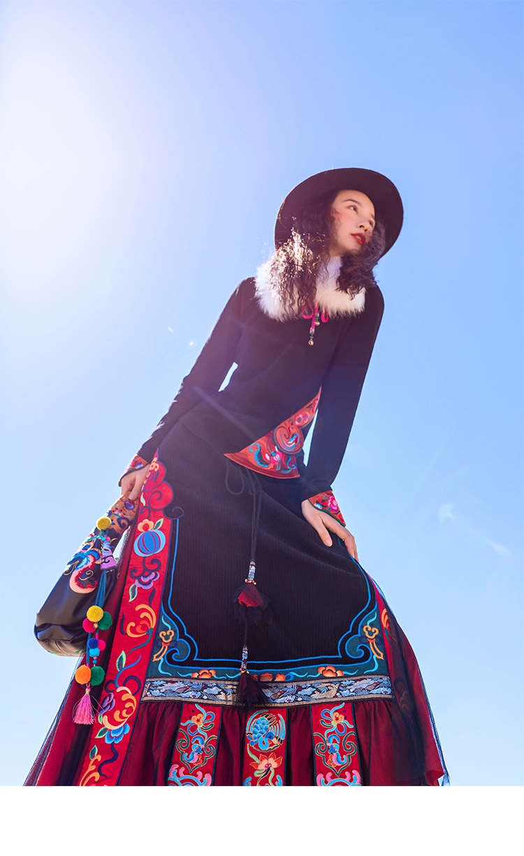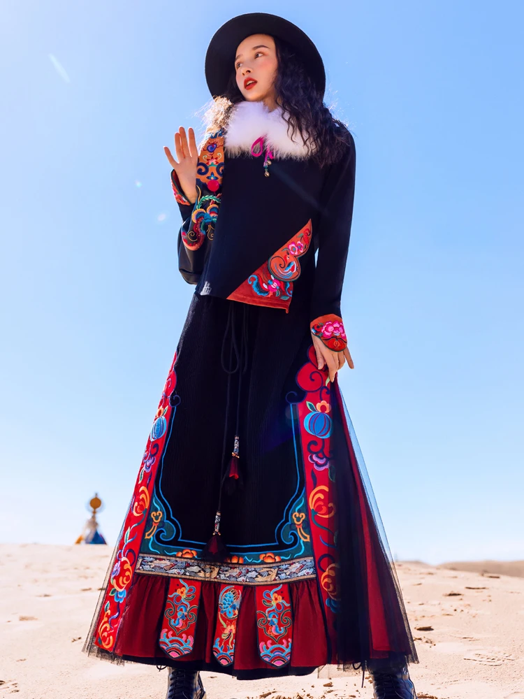 TIYIHAILEYбесплатная доставка; Сезон осень-зима; Плотная теплая длинная Вельветовая юбка макси с вышивкой и эластичной резинкой на талии в национальном китайском стиле