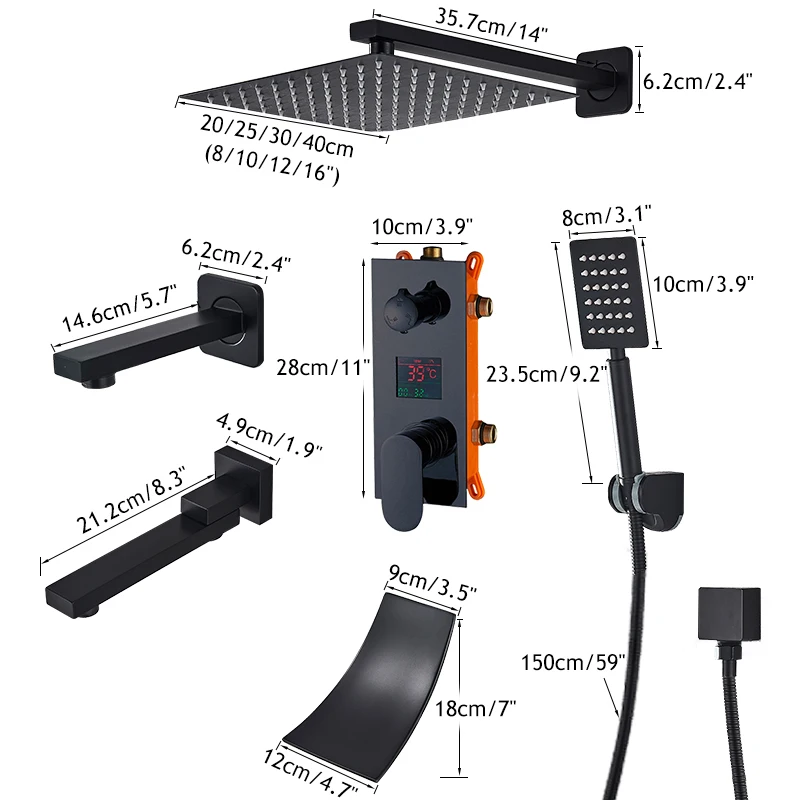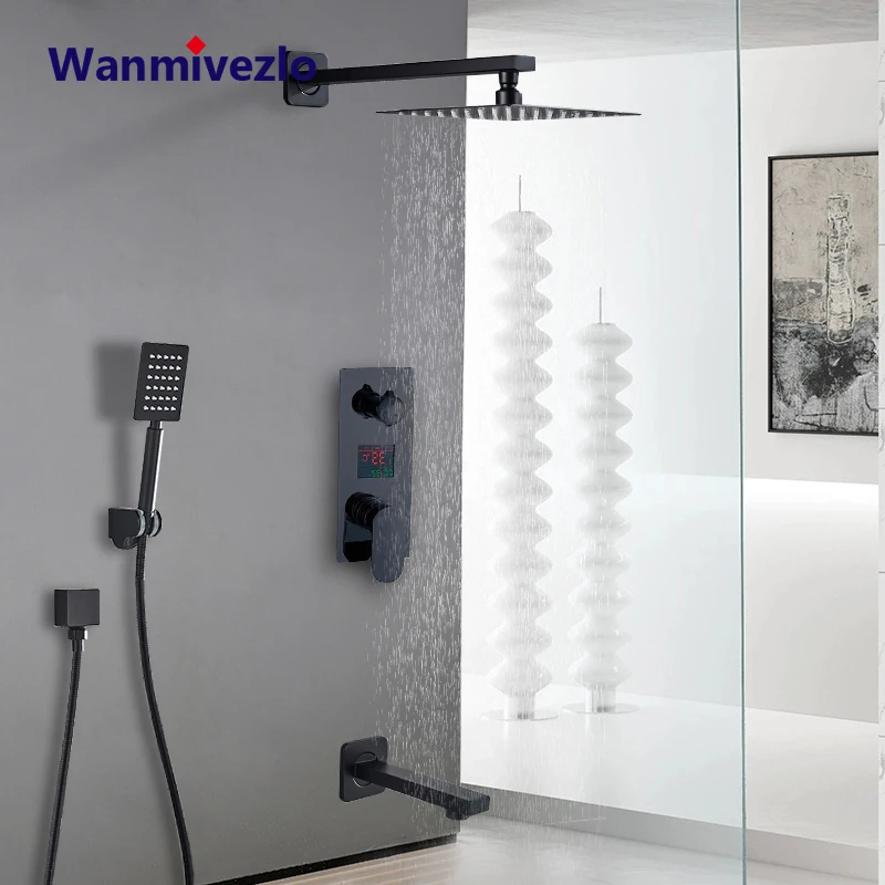 Матовый черный скрытый смеситель для душа с цифровым дисплеем, смеситель с дождевой лейкой, вращающийся/водопад, смеситель для ванны с носиком