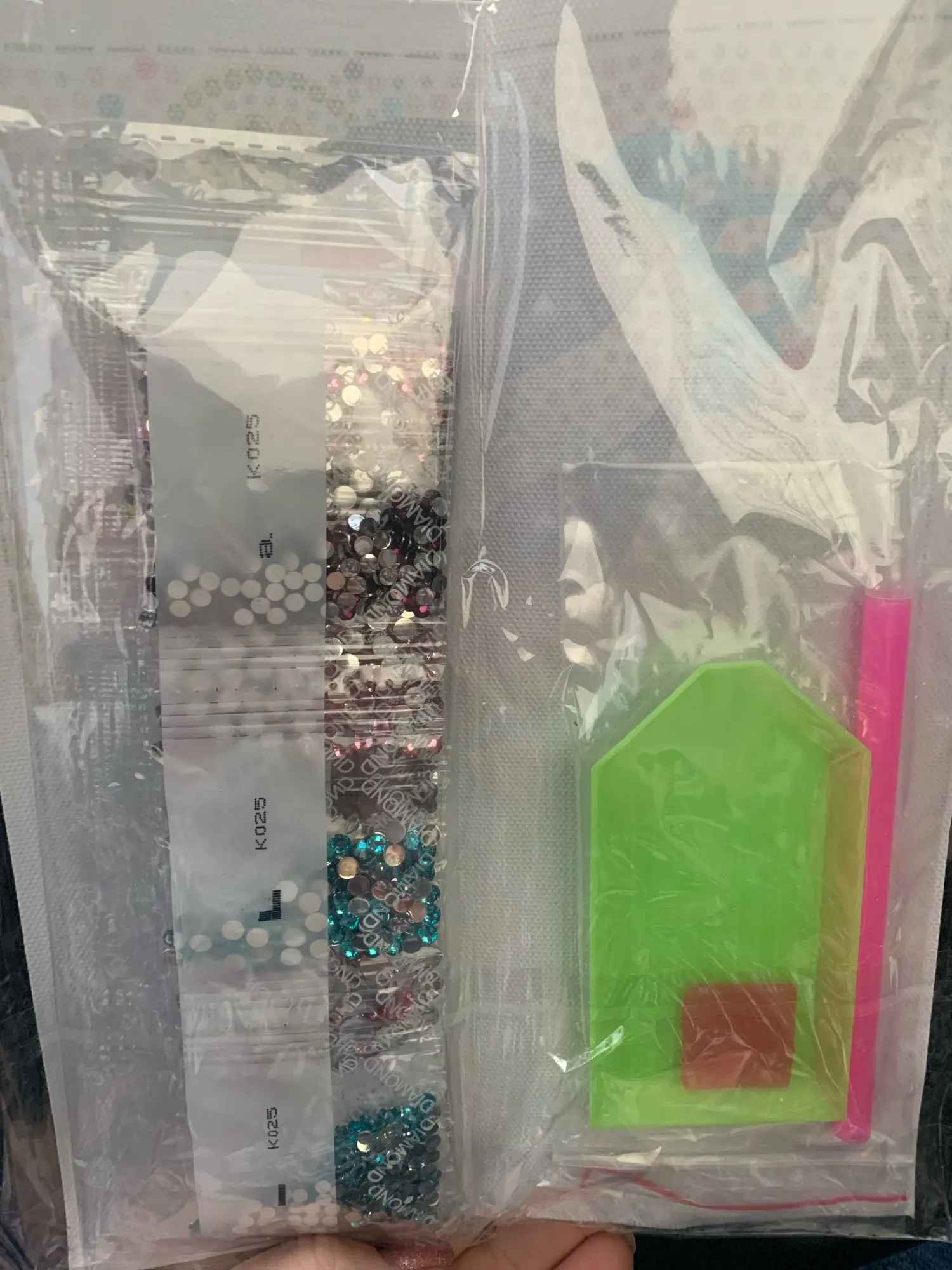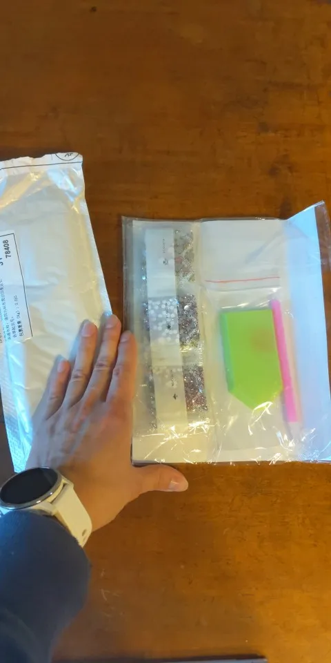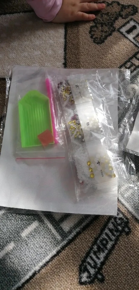 быстрая доставка. полный комплект (полотно, стразы, клей, ванночка, приспособление для клейки страз (палочка)). думала будет в коробке, упакована просто в пакет. прикрепляю фото с рукой, чтобы был понятен размер. в принципе, для детей большая мозаика и не нужна