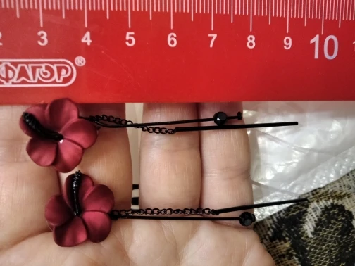 Доставка до Казани почти месяц. Упаковано в обычный почтовый пакет с пупыркой. Доехали целыми, что уже радует. Теперь по поводу фото продавца. Я конечно понимаю, что можно свалить на цветопередачу телефона/компьютера. Но чтоб на столько! Заказывала как раз из-за яркого красного цвета! В сочетании с черным - огонь! Но по факту пришли бордовые! На моем фото, линейка больше подходит на заявленный цвет серёг, сравните. Обидно, цена не три копейки с доставкой... В целом качество неплохое. Снизила звезду за цвет.