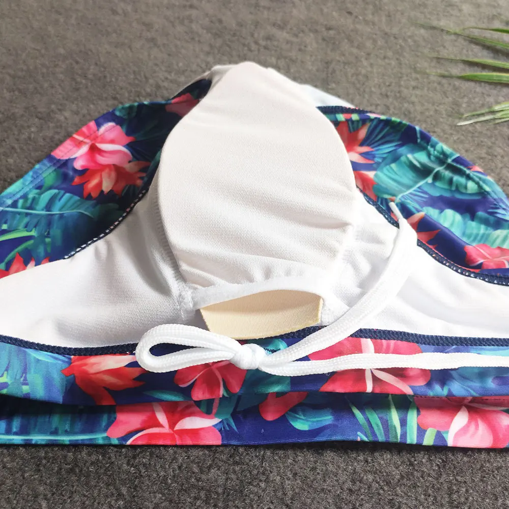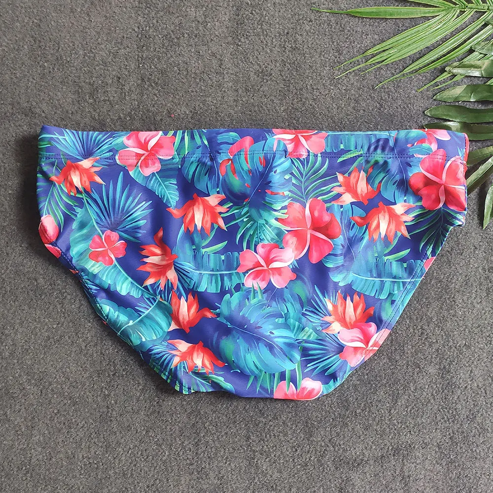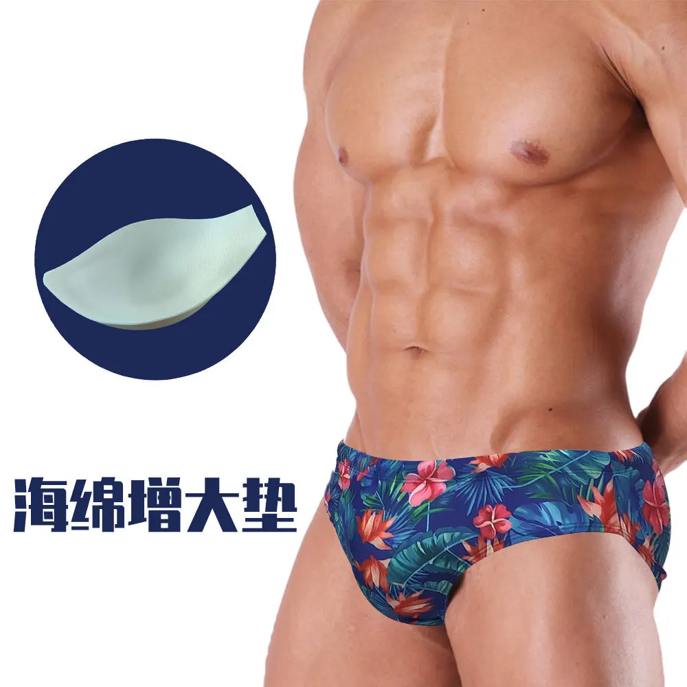 Мужские купальные костюмы 2021, бикини с/без губчатой подкладки, синие трусы с красными цветами/зелеными листьями, пляжные шорты для геев, мужские плавки