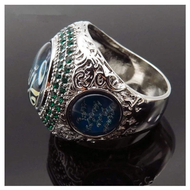 Кольцо мужское с узором руны, религиозное мусульманское кольцо с зеленым кристаллом в богемном стиле, инкрустированное рунами, аксессуары для вечеринок, ювелирные изделия