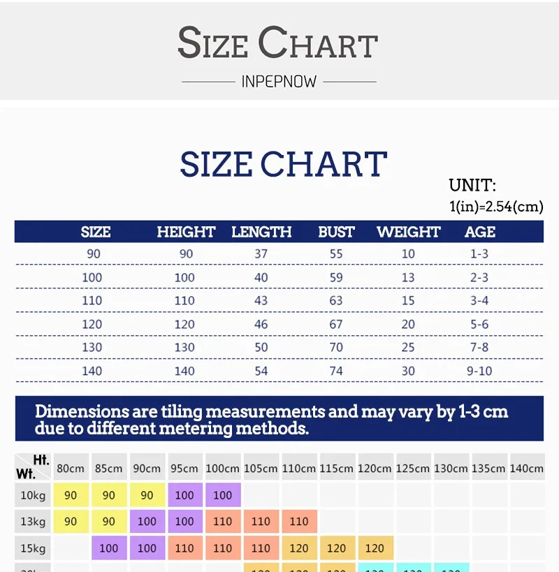 Таблица размеров для детских рубашек (единица измерения: см/дюйм) INPEPNOW