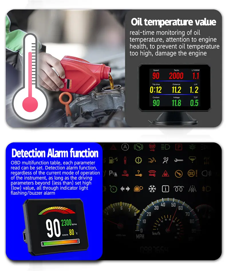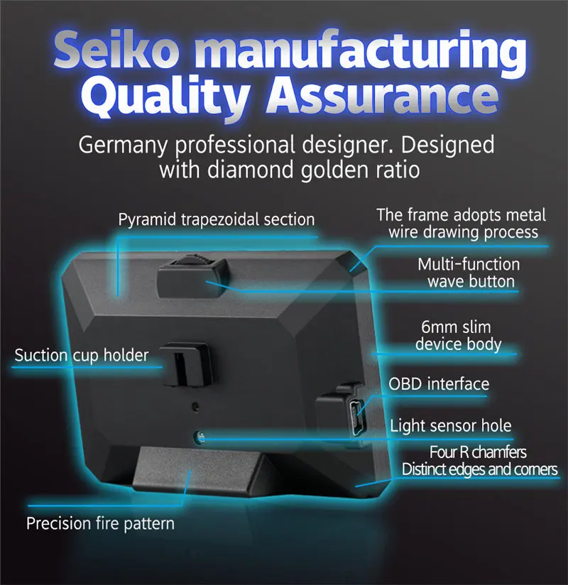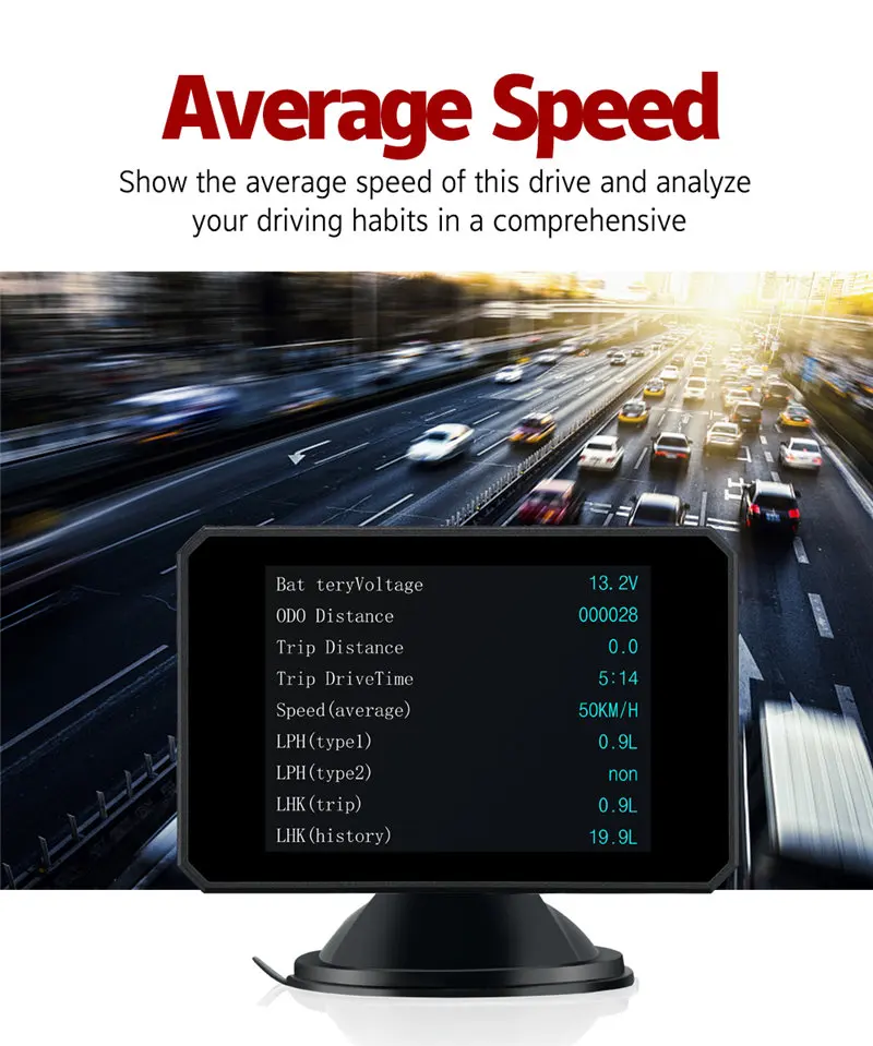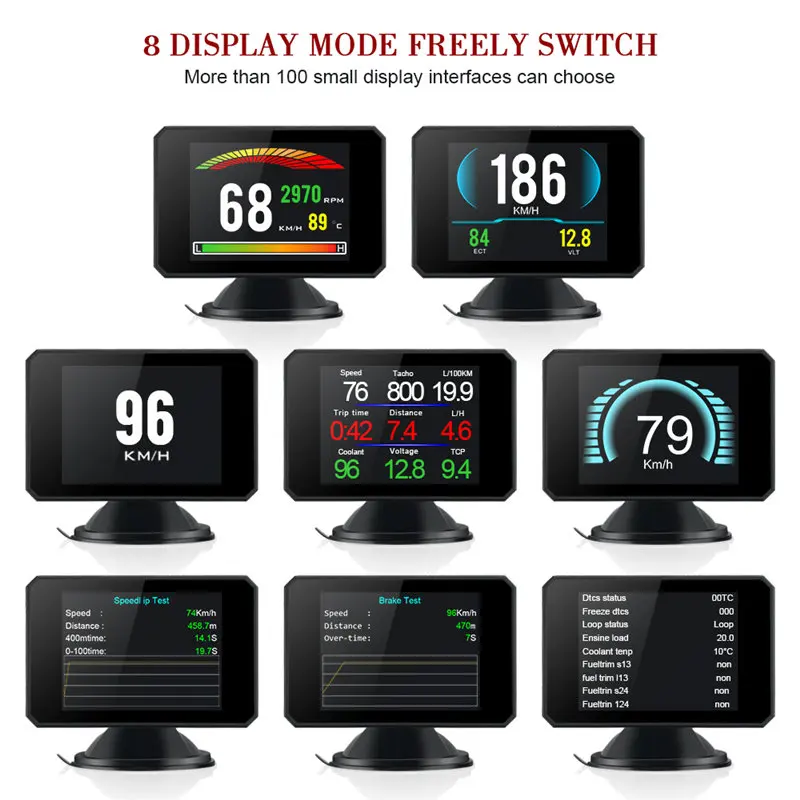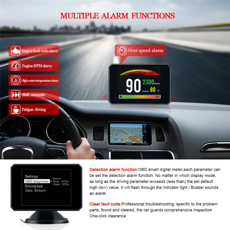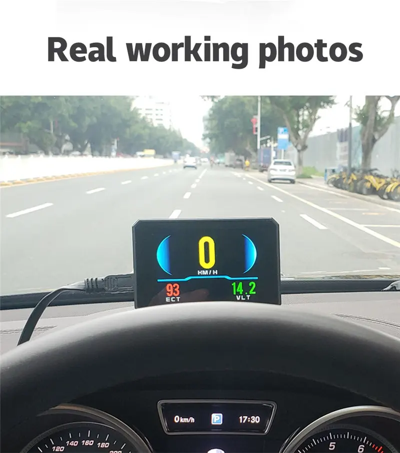 HUD короткий для дисплея головы вверх. Он отображает данные вождения на лобовом стекле, такие как скорость, об/мин, расход топлива, температура воды, напряжение, избегая небезопасности водителей из-за наблюдения за инструментом во время вождения. Водители могут читать информацию о вождении и всегда могут поддерживать Наилучшее Состояние на пути с HUD.