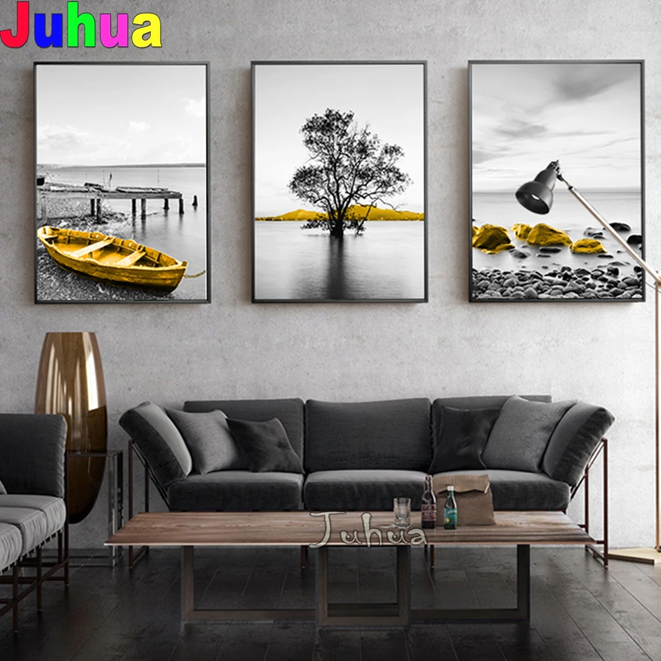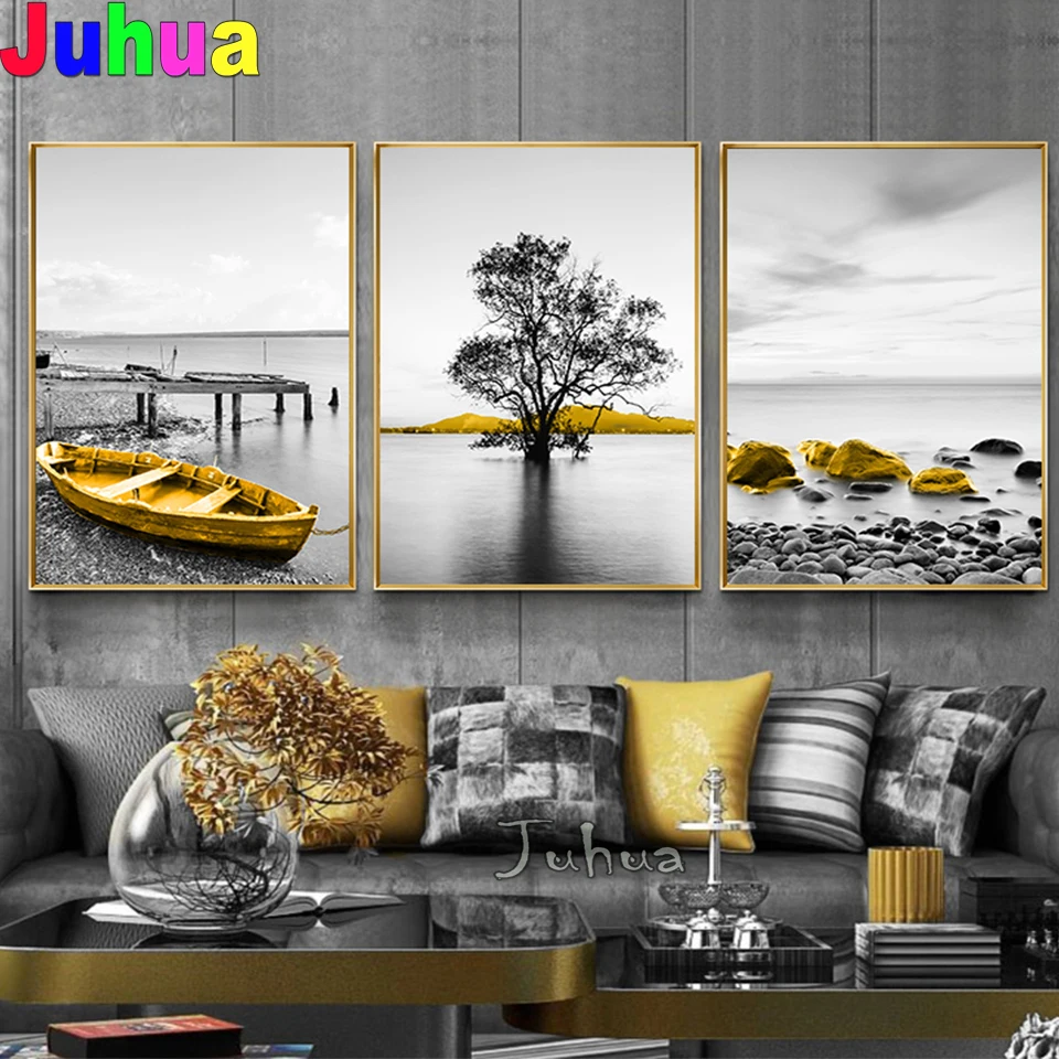 Алмазная картина из смолы 5d "сделай сам", морской пейзаж, дерево, лодка, жизнь, 3D вышивка, круглая дрель, вышивка крестиком, мозаика Триптих