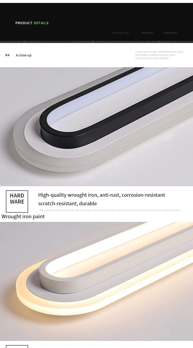 Скандинавский светодиодный светильник для кухни и спальни Dini... Источник света: SMD светодиодный чип Цветовая температура: теплый белый/холодный белый 1. Холодный белый: без пульта дистанционного управления. 2. Теплый белый: без пульта дистанционного управления. Светильник Жизненный цикл: 50000 часов напряжение: AC85-240 В Материал: алюминий + акрил Размер: 480*150 мм 33 Вт 580*150 мм 40 Вт 780*150 мм 52 Вт 1100*150 мм 72 Вт Цвет: белый/белый x Черный применение: гостиная, спальня, столовая, кухня, проход, коридор, балкон, вход, любые проблемы, пожалуйста, свяжитесь со службой поддержки клиентов, мы ответим вам в первый раз. Примечания: 1. Измерения выполнены вручную, допускается погрешность в 1-3 мм, спасибо за понимание. 2. Из-за разницы между различными мониторами изображение может не отражать фактический цвет изделия. Мы гарантируем, что тип одинаковый.