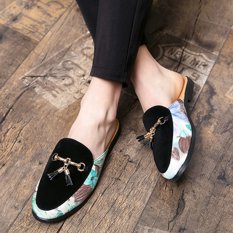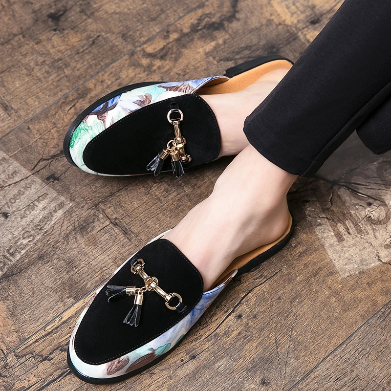 Мюли мужские с бахромой, Роскошные туфли с пряжкой, лоферы, кожаная обувь, ретро тапочки на плоской подошве, без застежки, для вечеринки