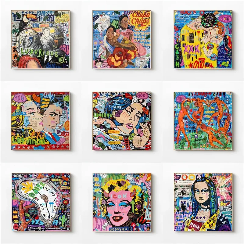 Граффити часы Мона Лиза влюбленная улица Искусство Печать на холсте Абстрактная фигурка Настенная картина для гостиной домашний декор плакат