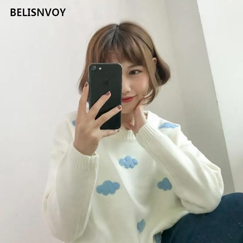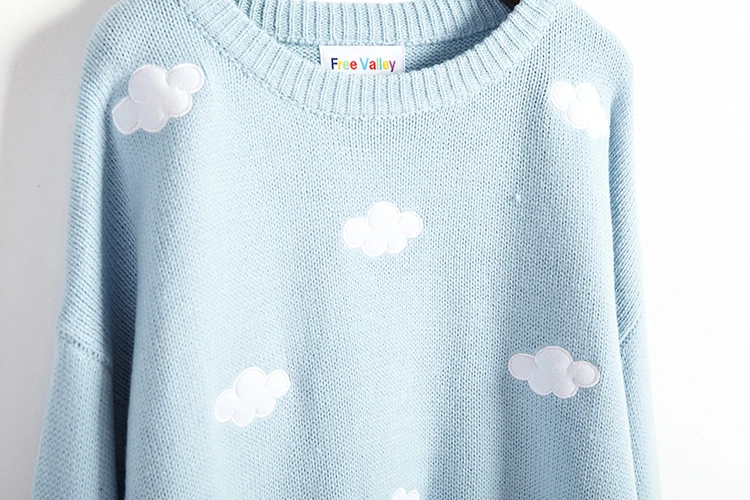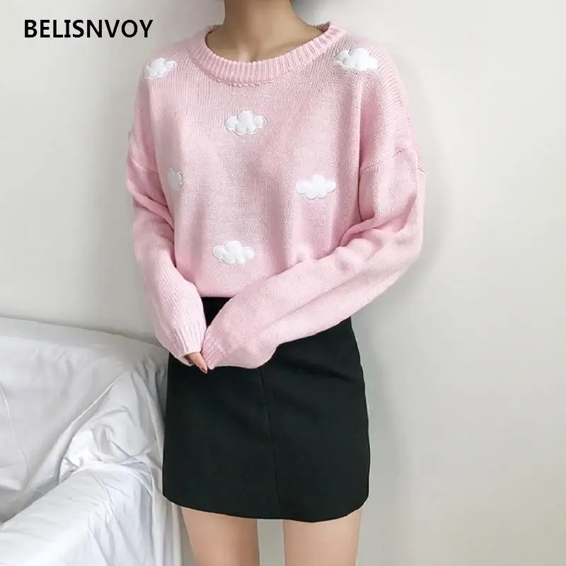 Весенний свободный розовый кавайный свитер с облаками, Женский пуло...